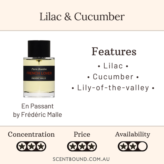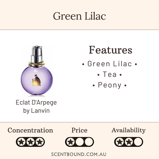These fragrances all have a prominent lilac note. Hover over each cover to learn more about the fragrance underneath.