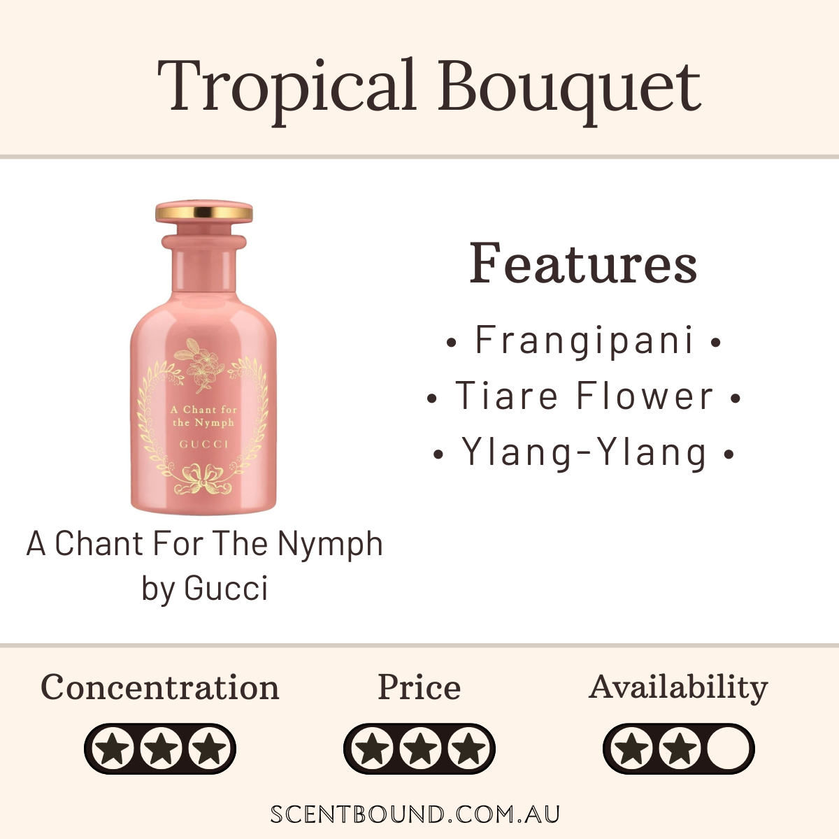 You can probably smell: Mixed tropical flowers; frangipani, tiare flower and ylang-ylang.