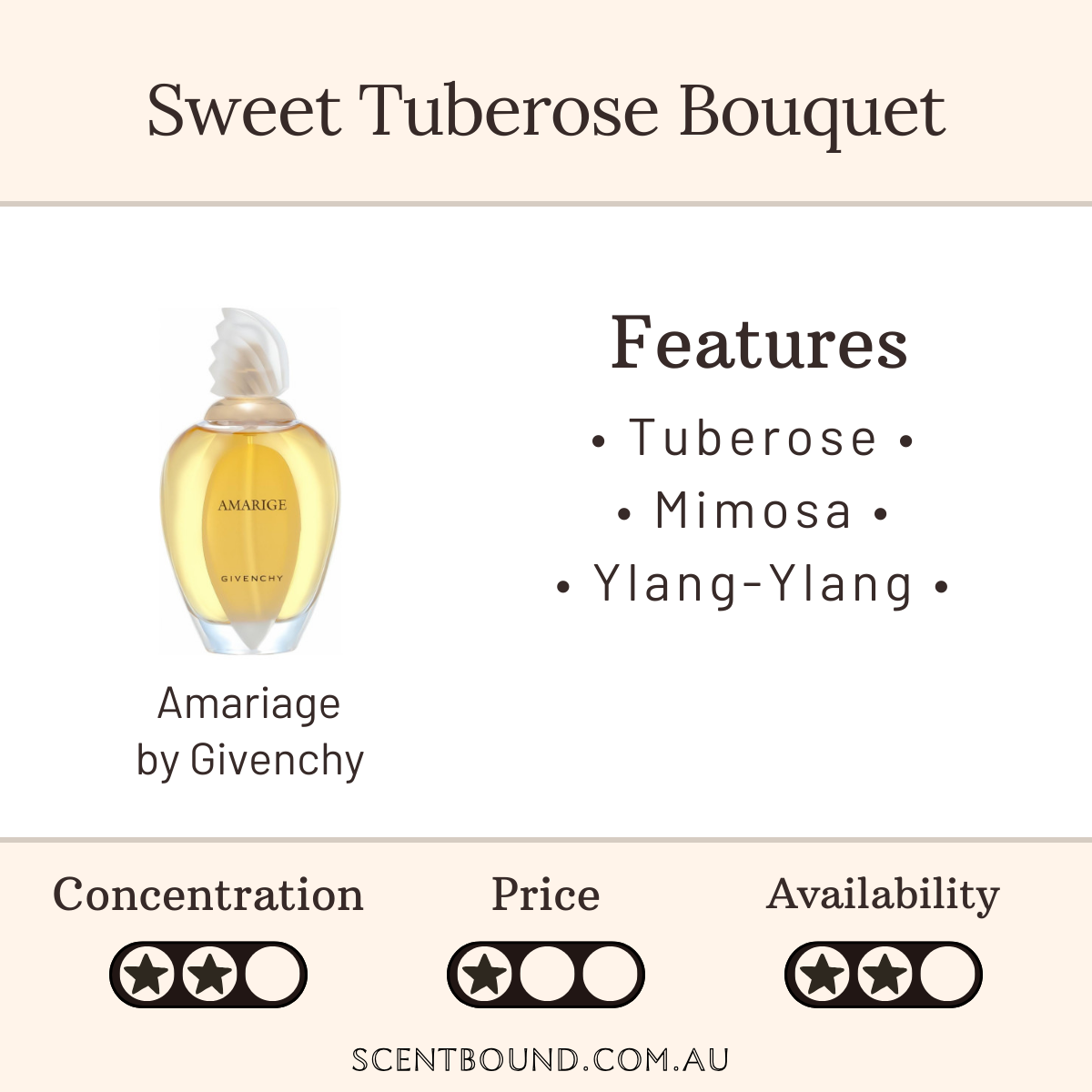 Notes: Top notes are Orange Blossom, Peach, Plum, Neroli, Brazilian Rosewood, Violet and Mandarin Orange; middle notes are Tuberose, Mimosa, Gardenia, Ylang-Ylang, Jasmine, Black locust, Carnation, Black Currant, Red Berries, Cassia, Rose and Orchid; base notes are Sandalwood, Amber, Woody Notes, Vanilla, Musk, Tonka Bean and Cedar.