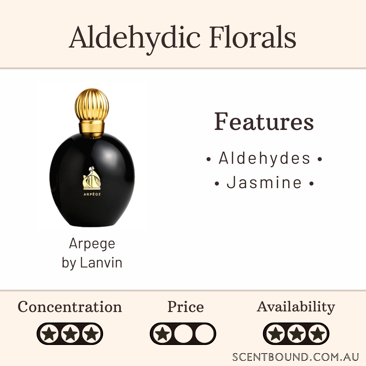 Notes: Top notes are Aldehydes, Lily-of-the-Valley, Peach, Honeysuckle, Neroli and Bergamot; middle notes are Jasmine, Ylang-Ylang, Lily-of-the-Valley, Iris, Coriander, Rose, Lily, Geranium and Camellia; base notes are Sandalwood, Amber, Vetiver, Musk, Benzoin, Vanilla and Patchouli.