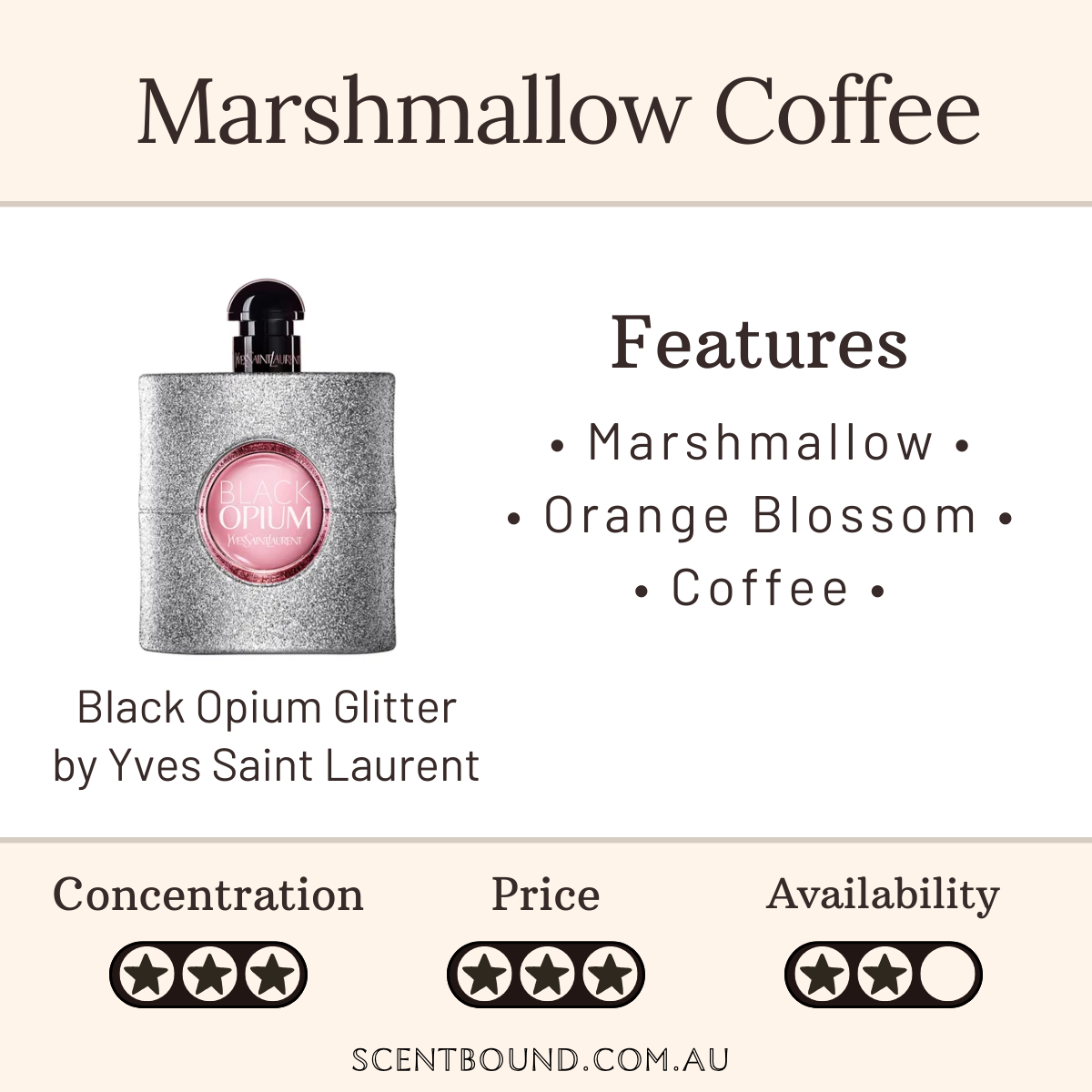 You can probably smell: Marshmallow, Coffee, Orange Blossom and Vanilla.