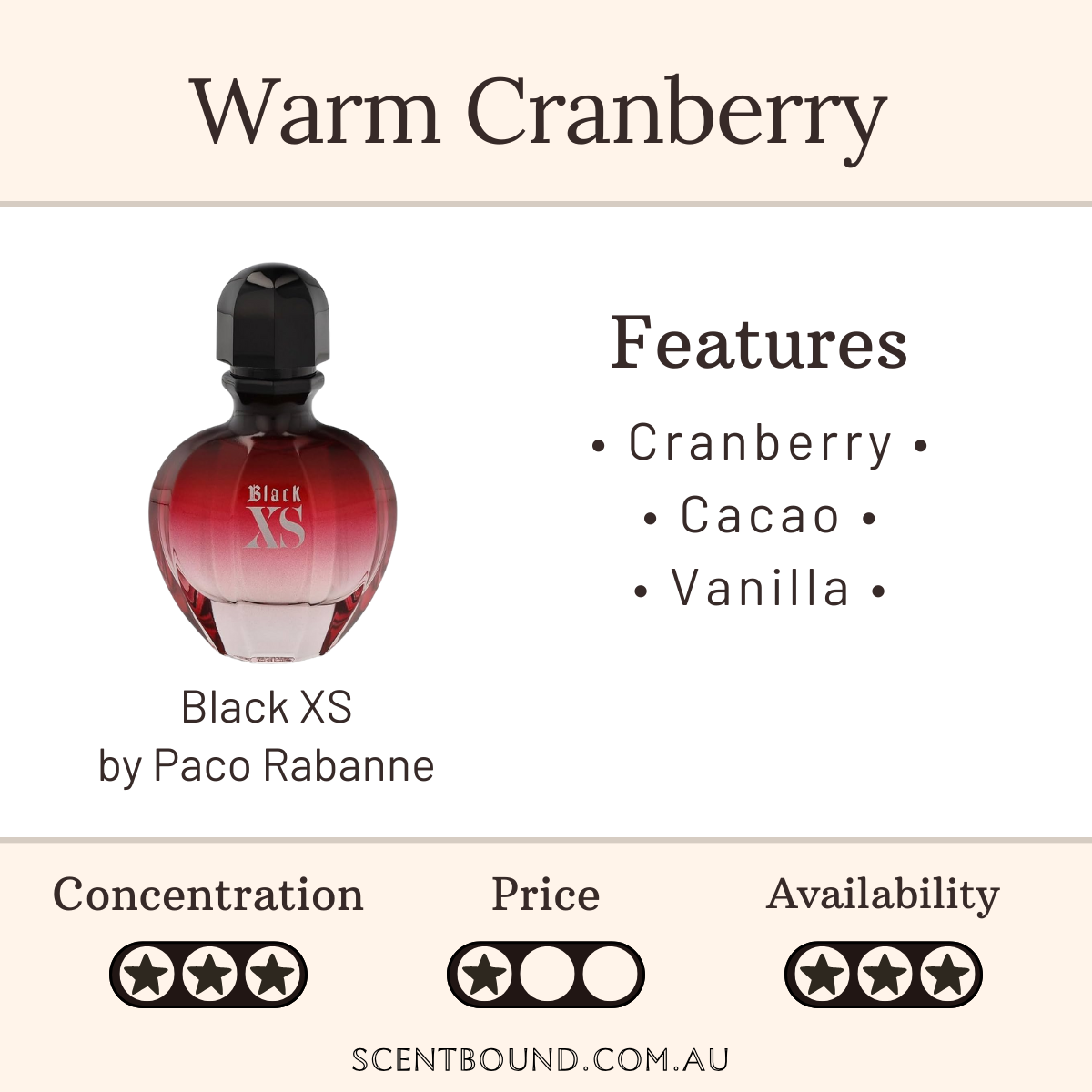 Notes: Top notes are Cranberry, Pink Pepper and Tamarind; middle notes are Cacao, Rose and Black Violet; base notes are Vanilla, Patchouli and Massoia Wood.