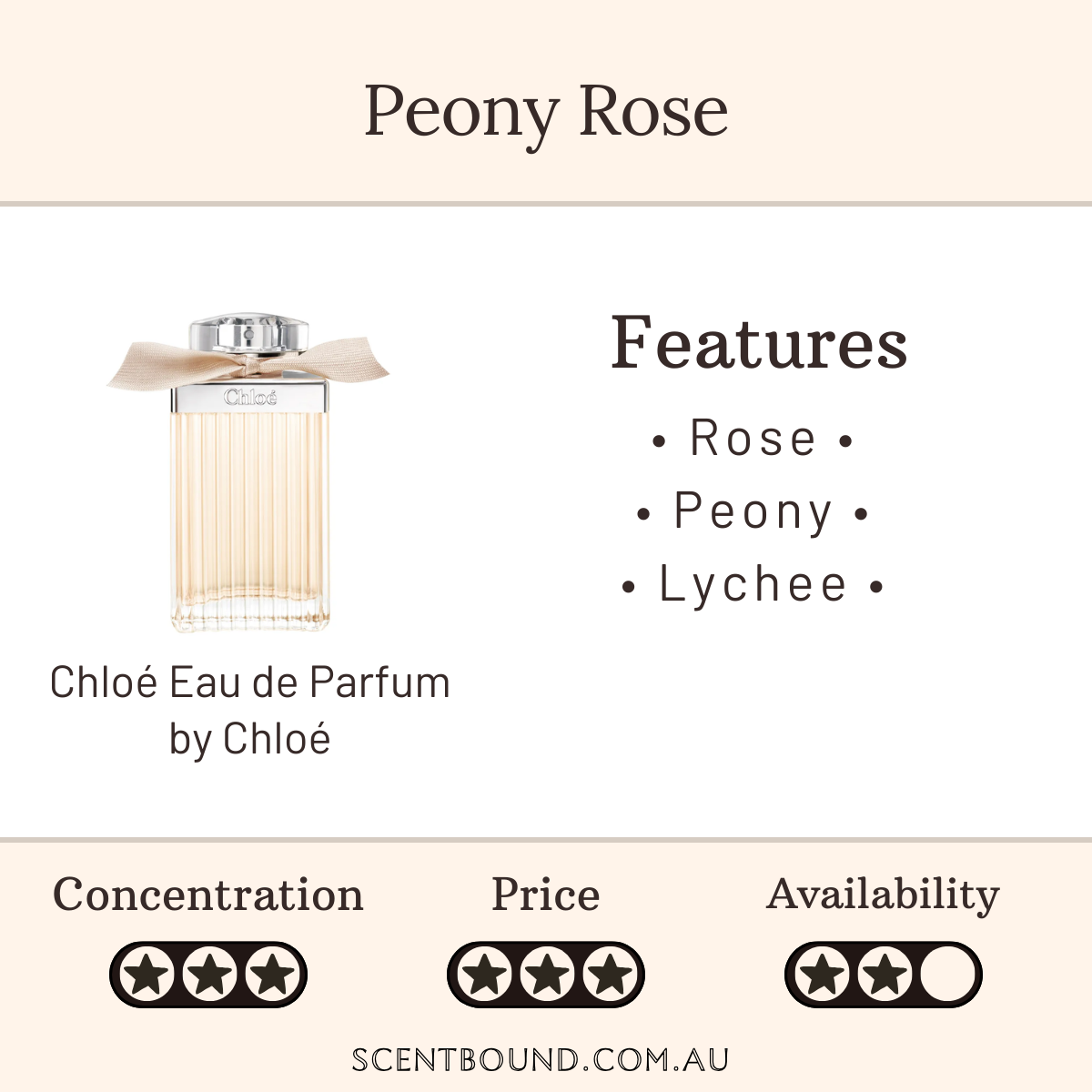 Notes: Top notes are Peony, Litchi and Freesia; middle notes are Rose, Lily-of-the-Valley and Magnolia; base notes are Virginia Cedar and Amber.