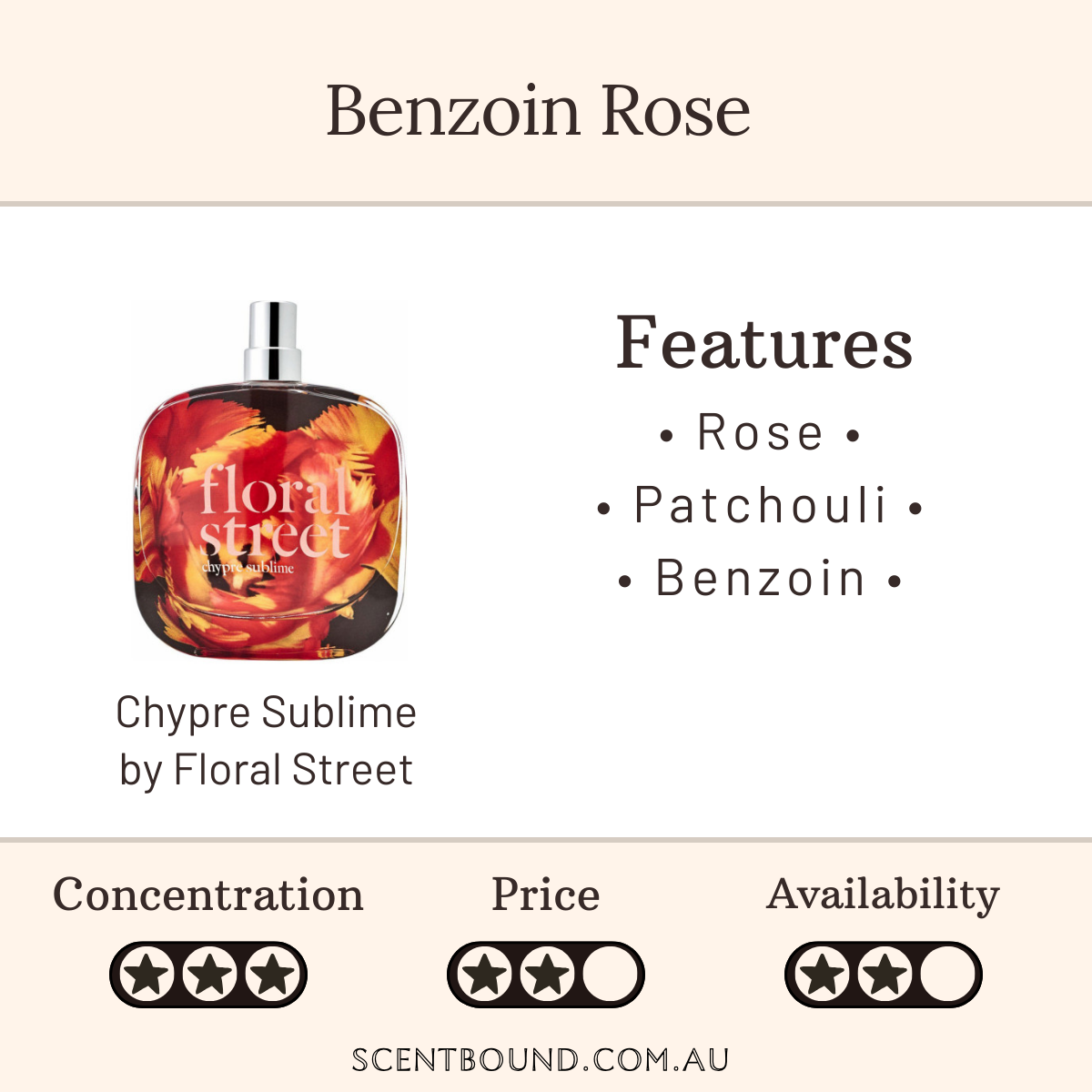 You can probably smell: Rose, geranium, patchouli and benzoin.