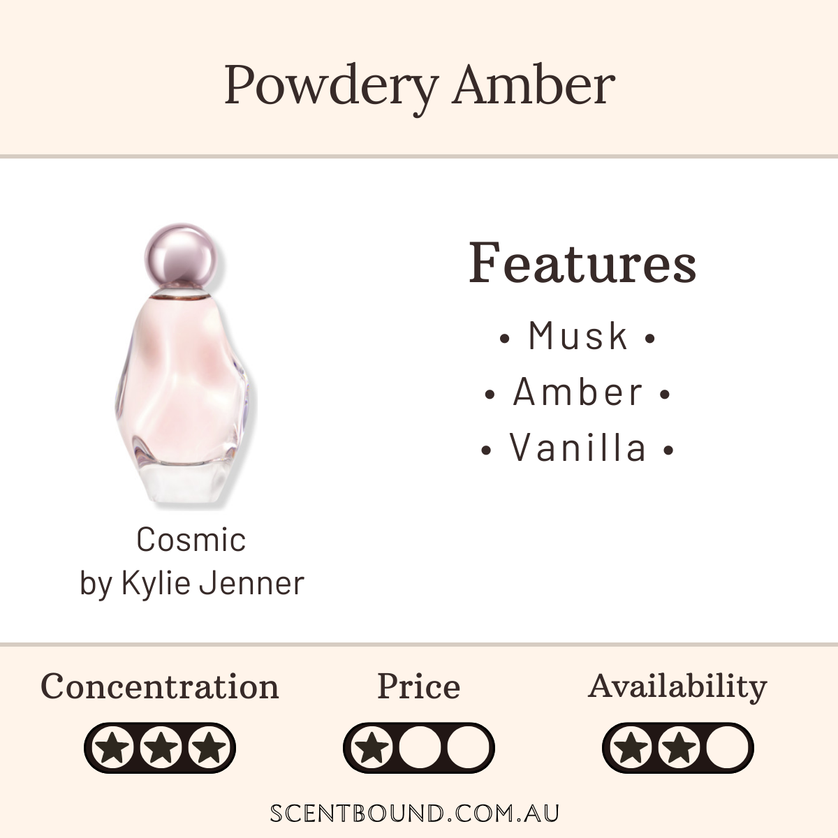 Description: cosmic kylie jenner is a sweet, warm floral, elevated scent that is perfect for day and night. an ambery floral eau de parfum, the scent is magnetic, addictive, and out of this world. the sculptural bottle was designed to look like a piece of art from another world and is formed to fit perfectly in the palm of your hand.