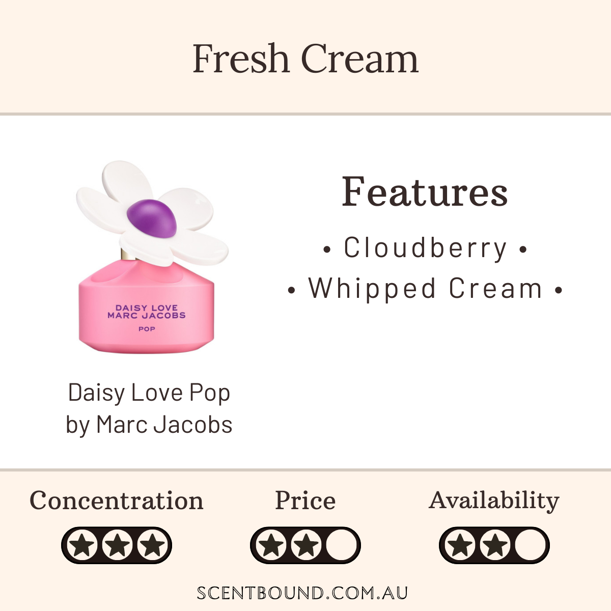 Description: The sunny and airy aromas of cloudberry and bergamot unfold into a heavenly heart of smooth, green pistachio and chantilly cream. Velvety sorbettolide blends with the warm tones of benzoin, creating an addictive scent that makes Marc Jacobs Daisy Love a fragrance to be adored.
