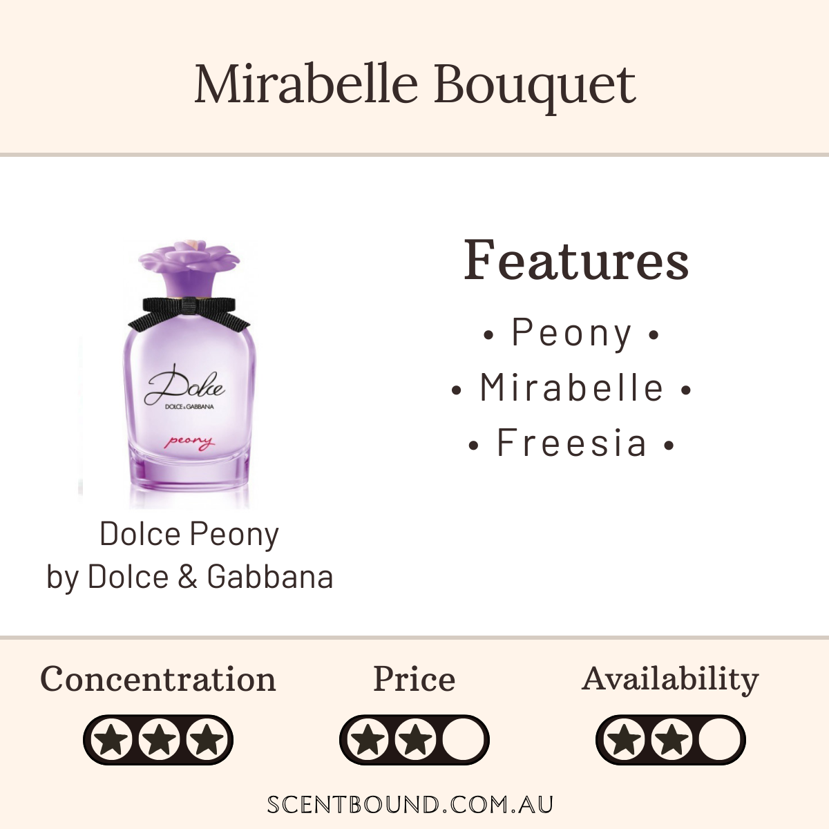 Description: The fifth fragrance of the Dolce line puts the peony flower on a pedestal, as a symbol of positive energy. The composition is nostalgic and feminine, abounding with freshness, juicy fruitiness, rich florals and the softness of honey.