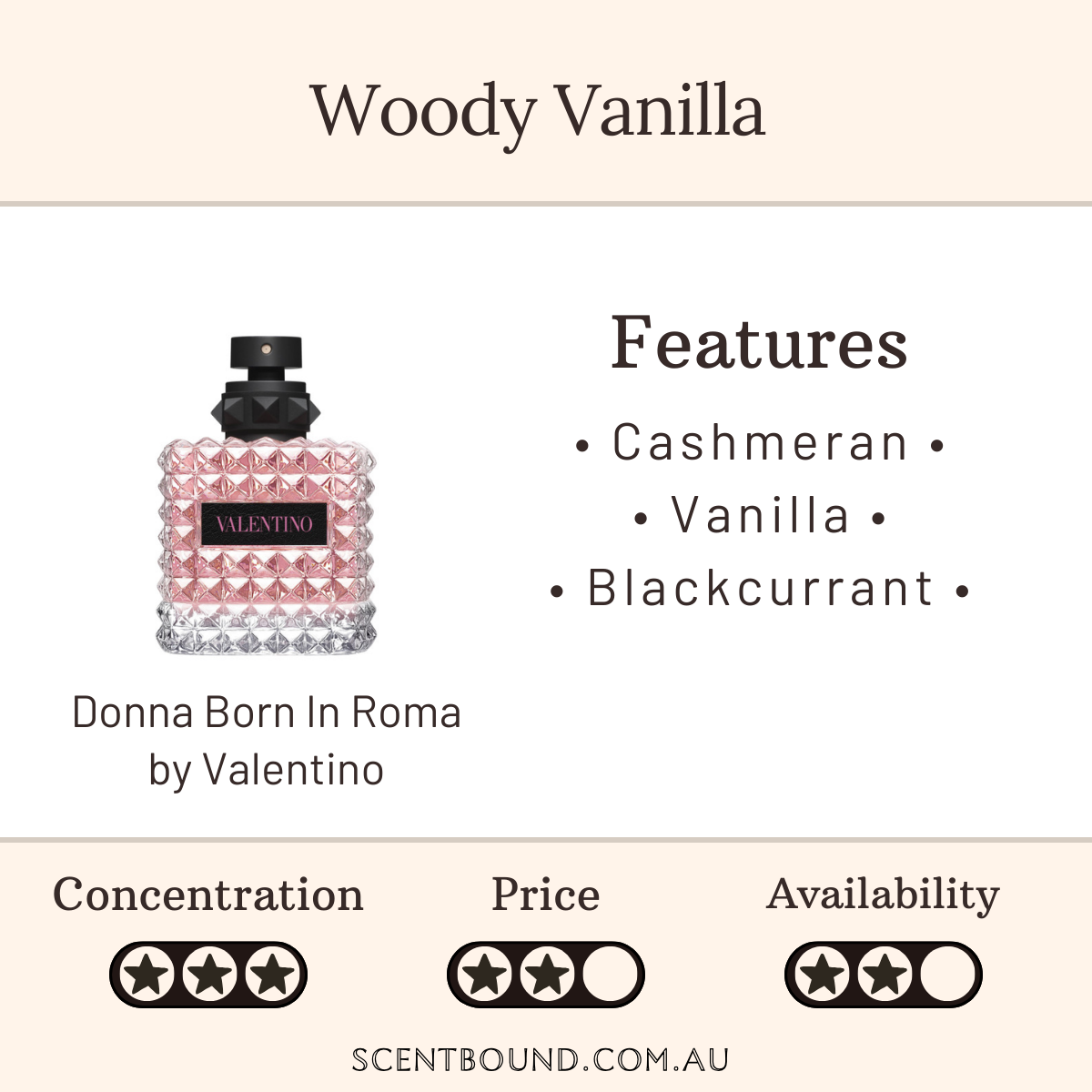 Description: Donna Born in Roma is a modern haute couture floriental. A couture elegance made of three qualities of jasmine brings a luxurious femininity, then blended with vanilla bourbon, the most expensive extract in the world. This is twisted with a radiant trio of modern woods, which gives an edgy touch reminiscent of Rome street culture.Notes: Top notes are Black Currant, Pink Pepper and Bergamot; middle notes are Jasmine, Jasmine Sambac and Jasmine Tea; base notes are Bourbon Vanilla, Cashmeran and Guaiac Wood.