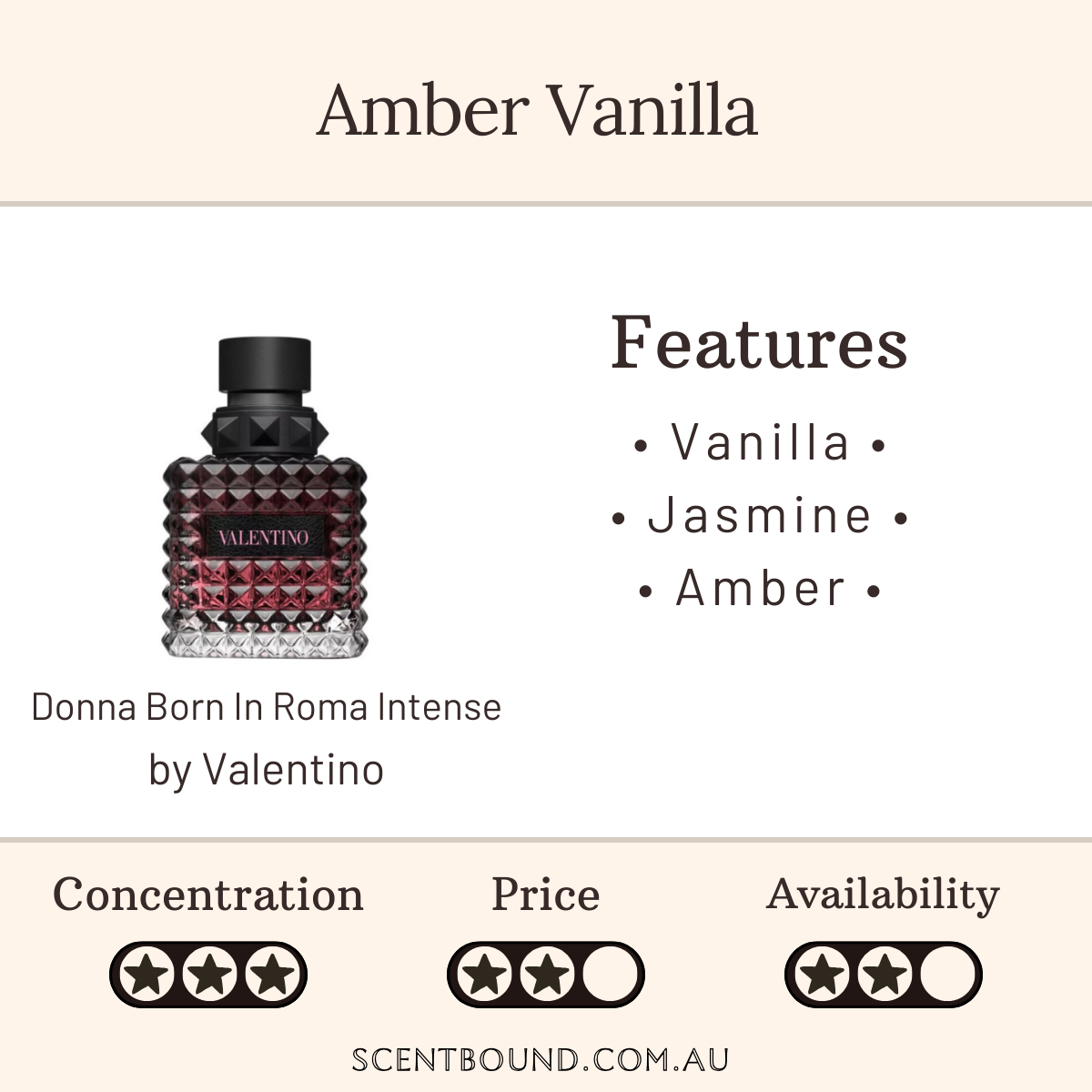 Notes: Top notes are Bourbon Vanilla and Amber; middle note is Jasmine; base note is Benzoin.