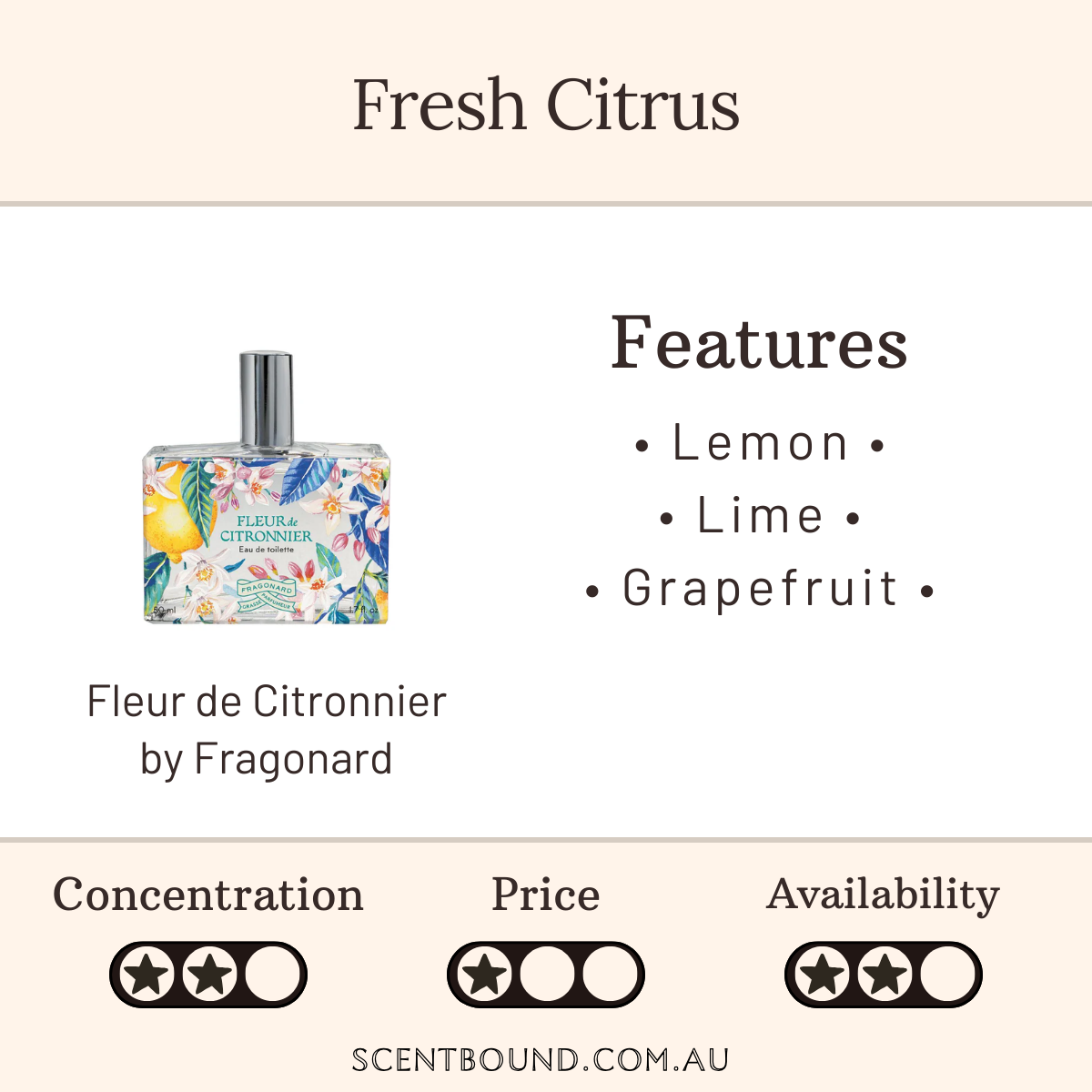 Top notes: Italian lemon, grapefruit, Argentine lime, and Brazilian orange