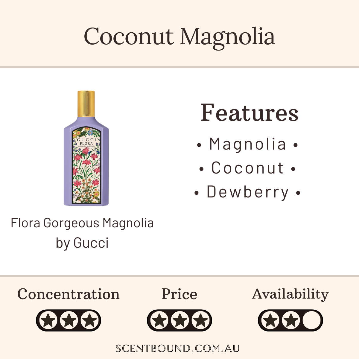 Top notes are Dewberry, Coconut and Orange; middle notes are Magnolia, Jasmine Sambac, Ylang-Ylang and Lily of the Valley; base notes are Musk, Patchouli and Blonde Woods.