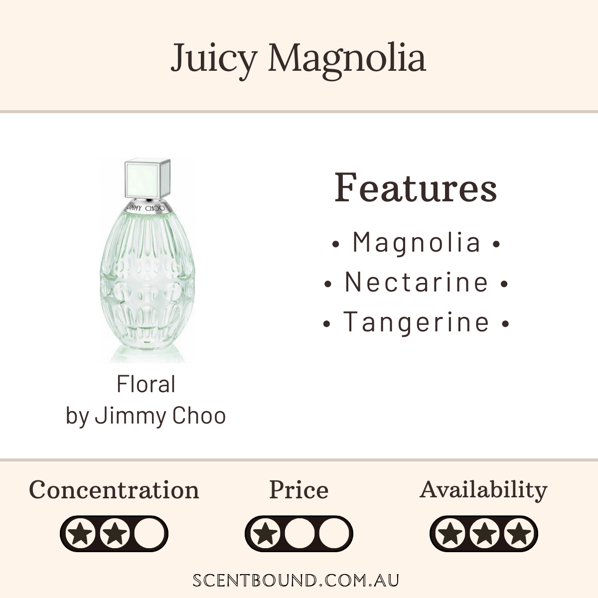 You can probably smell: Mixed florals of magnolia and apricot blossom, alongside juicy nectarine and tangerine.