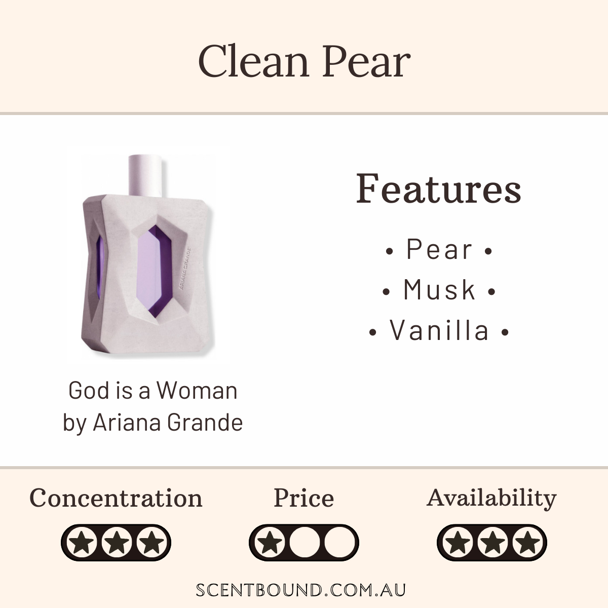 You can probably smell: Pear, ambrette (musk mallow) and vanilla.