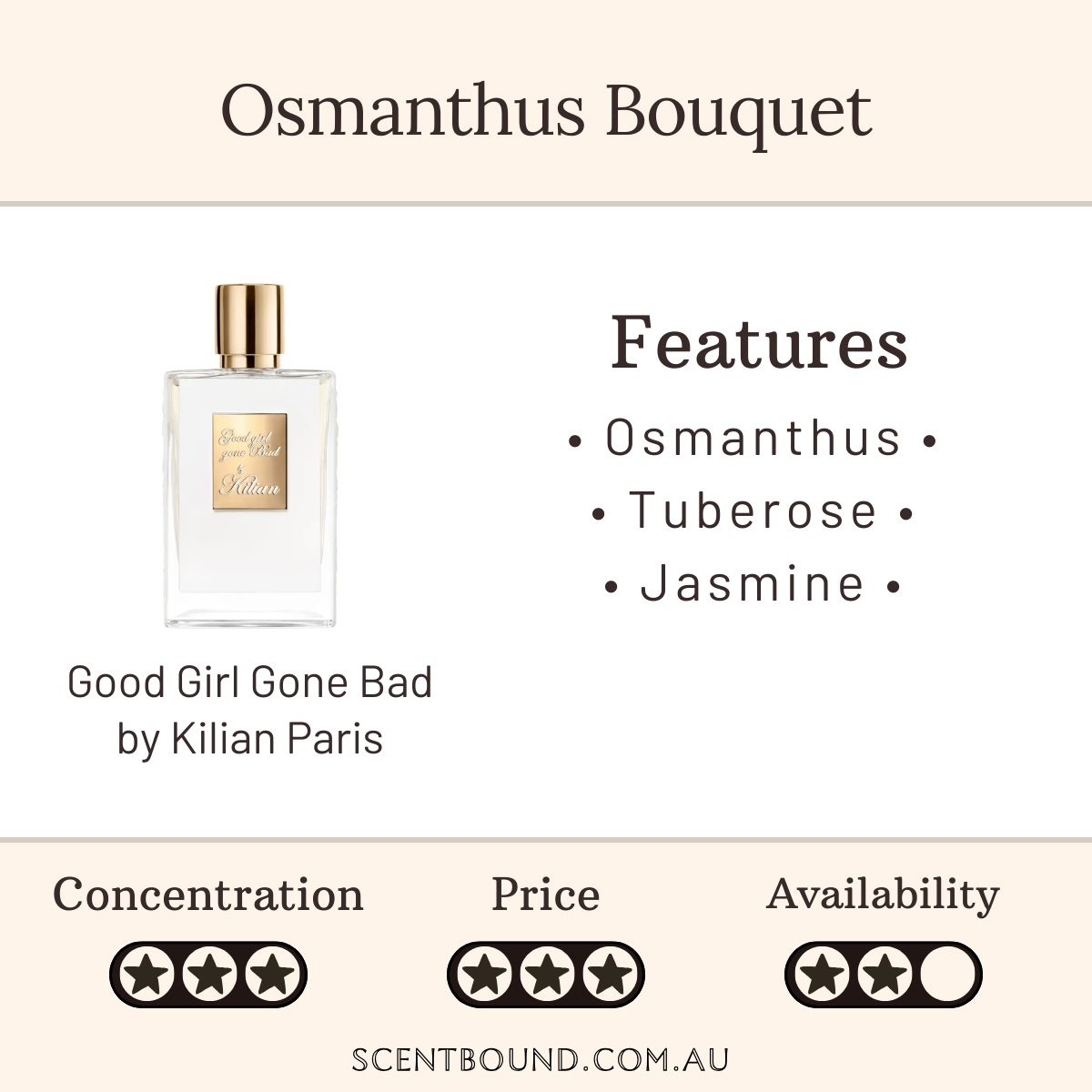 The notes: Top notes are Osmanthus, Peach, Neroli, Bergamot, Mandarin and Cinnamon; middle notes are Indian Tuberose, Jasmine, Narcissus and May Rose; base notes are Amber, Cedar, Vetiver, Sandalwood and Patchouli.