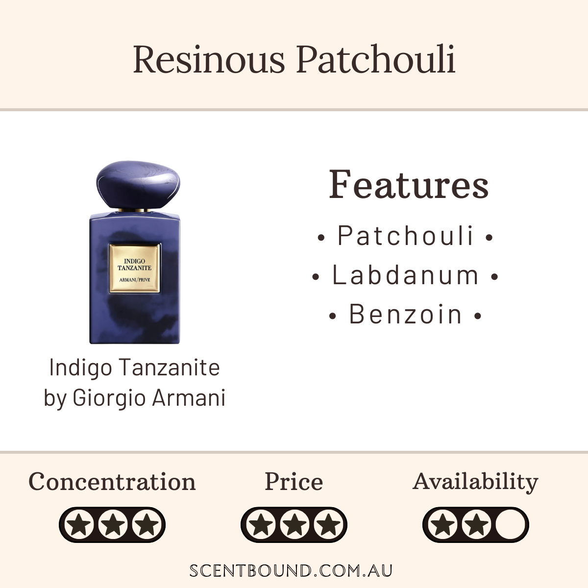 You can probably smell: Patchouli, resin, balsamic notes.