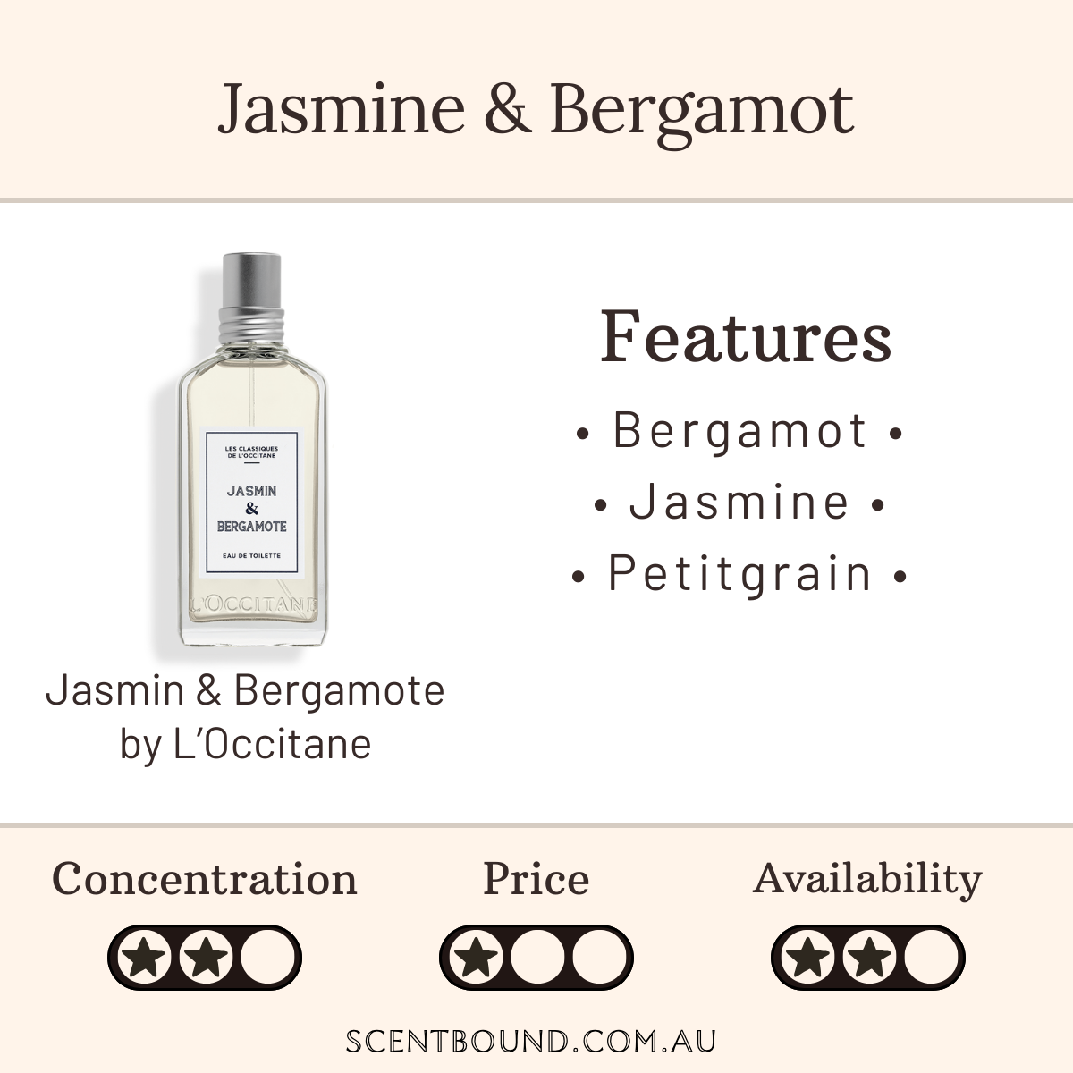 You can probably smell: Jasmine and bergamot, with a little petitgrain (the scent of crushed citrus leaves).