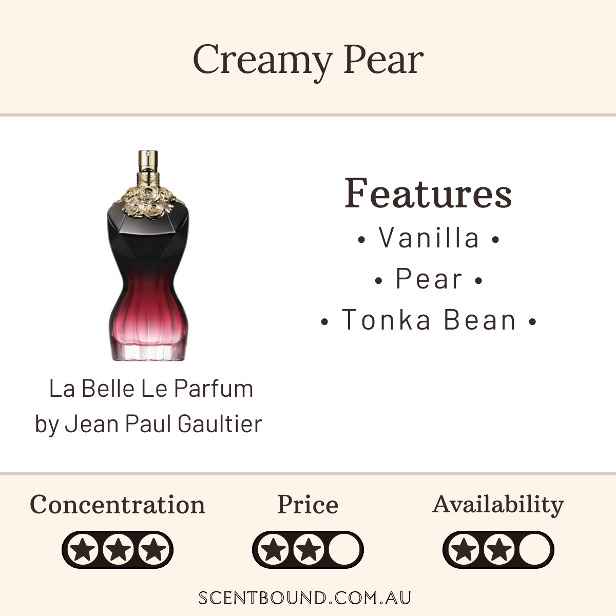 Notes: Top note is Pear; middle notes are Tonka Bean and Jasmine; base note is Vanilla.