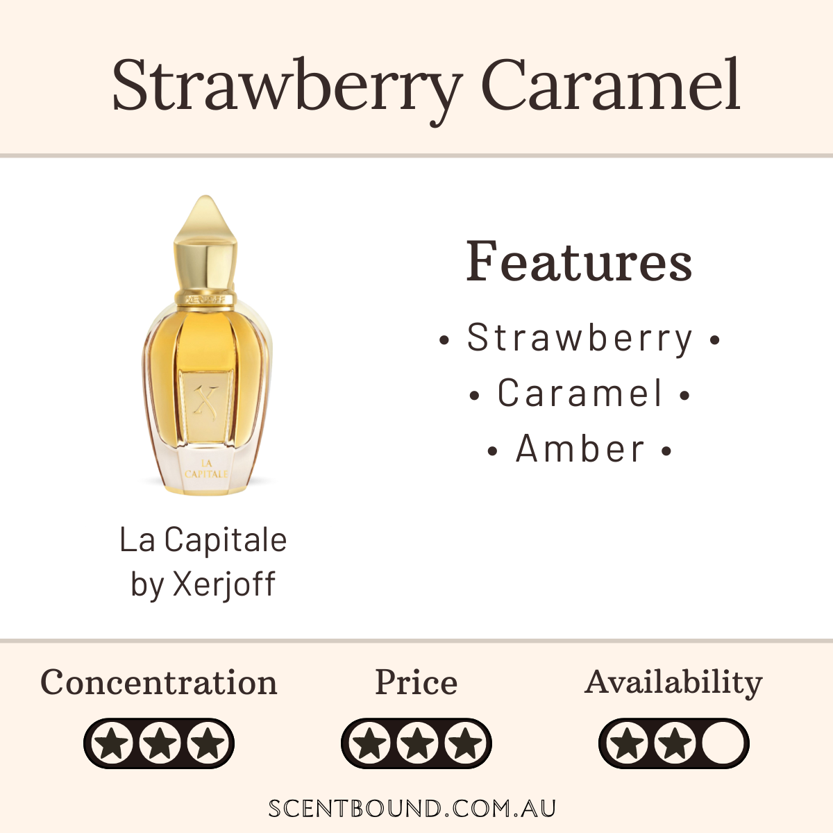 Top notes: Strawberry, Peach, Labdanum, Caramel
