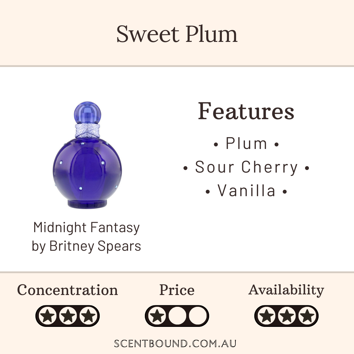 Notes: Top notes are Plum, Sour Cherry and Raspberry; middle notes are Orchid, Iris and Freesia; base notes are Vanilla, Musk and Amber.