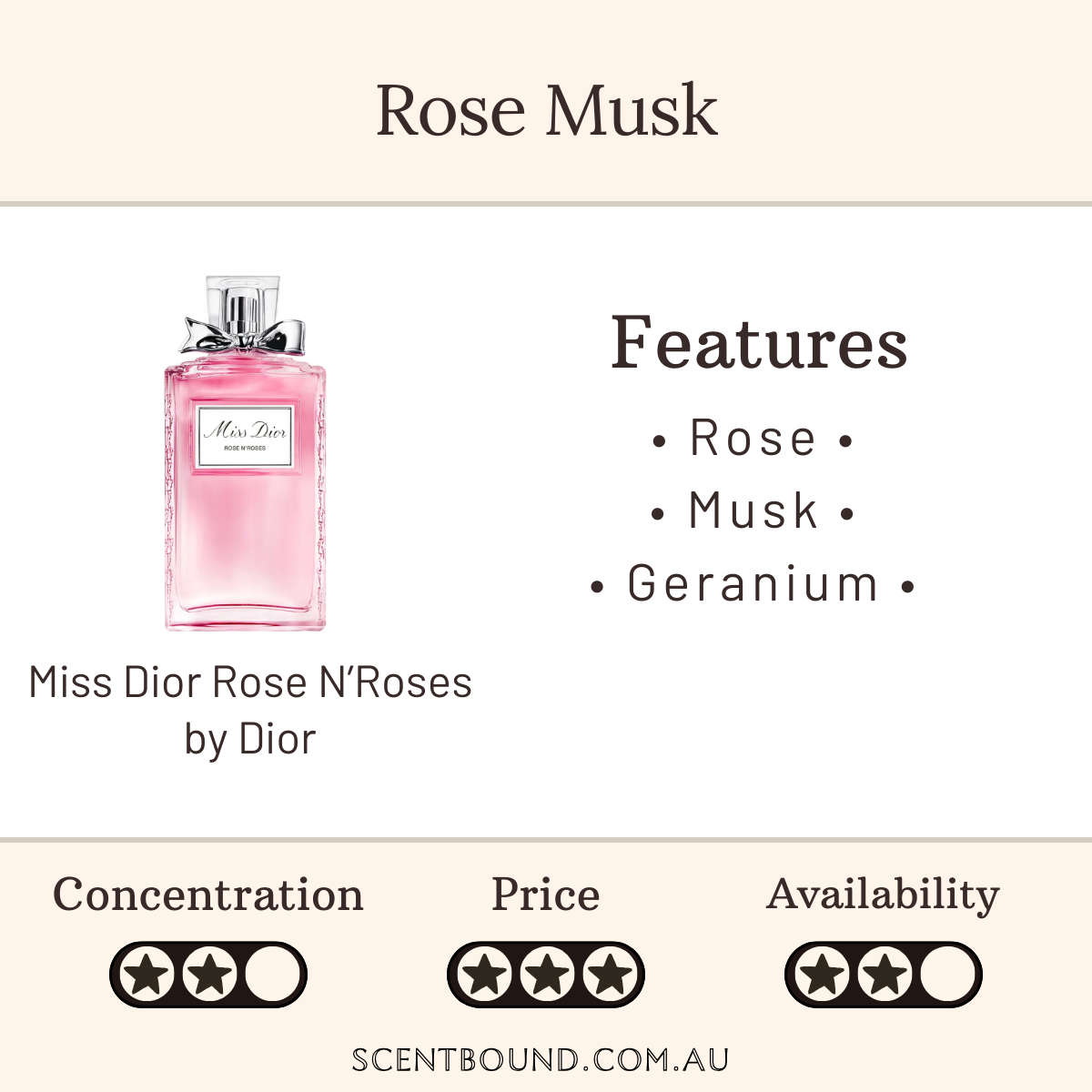 Top notes are Geranium, Bergamot and Italian Mandarin; middle notes are Grasse Rose and Damask Rose; base note is White Musk.