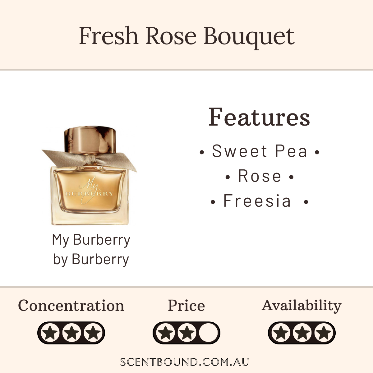 Description: My Burberry Eau de Parfum captures the scent of a London garden after the rain, as the sun warms wet gravel. A Grand floral with an unexpected edge. Top notes of sweet pea and bergamot fuse with a heart of geranium, golden quince and freesia, rounded out with base notes of rain-tipped damask and centifolia roses and patchouli.