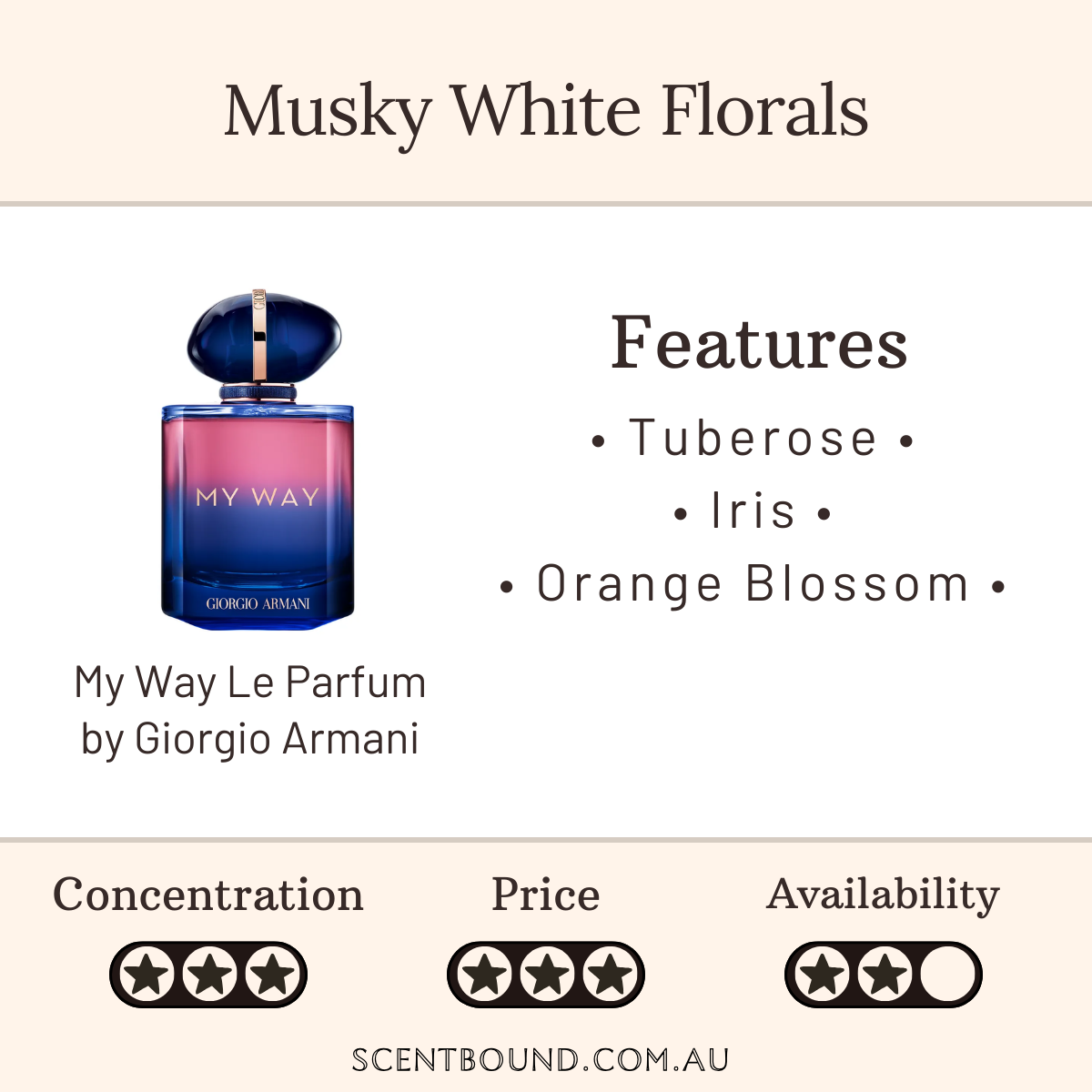 Description: My Way Le Parfum opens with fresh, citrusy notes of Bergamot Oil from Calabria, blending with sparkling Orange Blossom enfleurage in bitter orange oil from Egypt. A new intense heart, born from the contrast between the solar, creamy velvety notes of Tuberose Heart Absolute from India, and the majestic freshness of Iris Pallida from France. The vanilla and woody base is enhanced by the sensual creamy notes of Cedarwood from USA, with the delicious Vanilla Bourbon Infusion from Madagascar, both magnified by white musks for an enveloping, second skin effect.