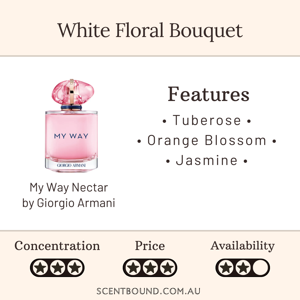 Top notes are Pear, Orange Blossom and Bergamot; middle notes are Tuberose, Jasmine and Violet Leaf; base notes are White Musk, Bourbon Vanilla and Cedarwood.