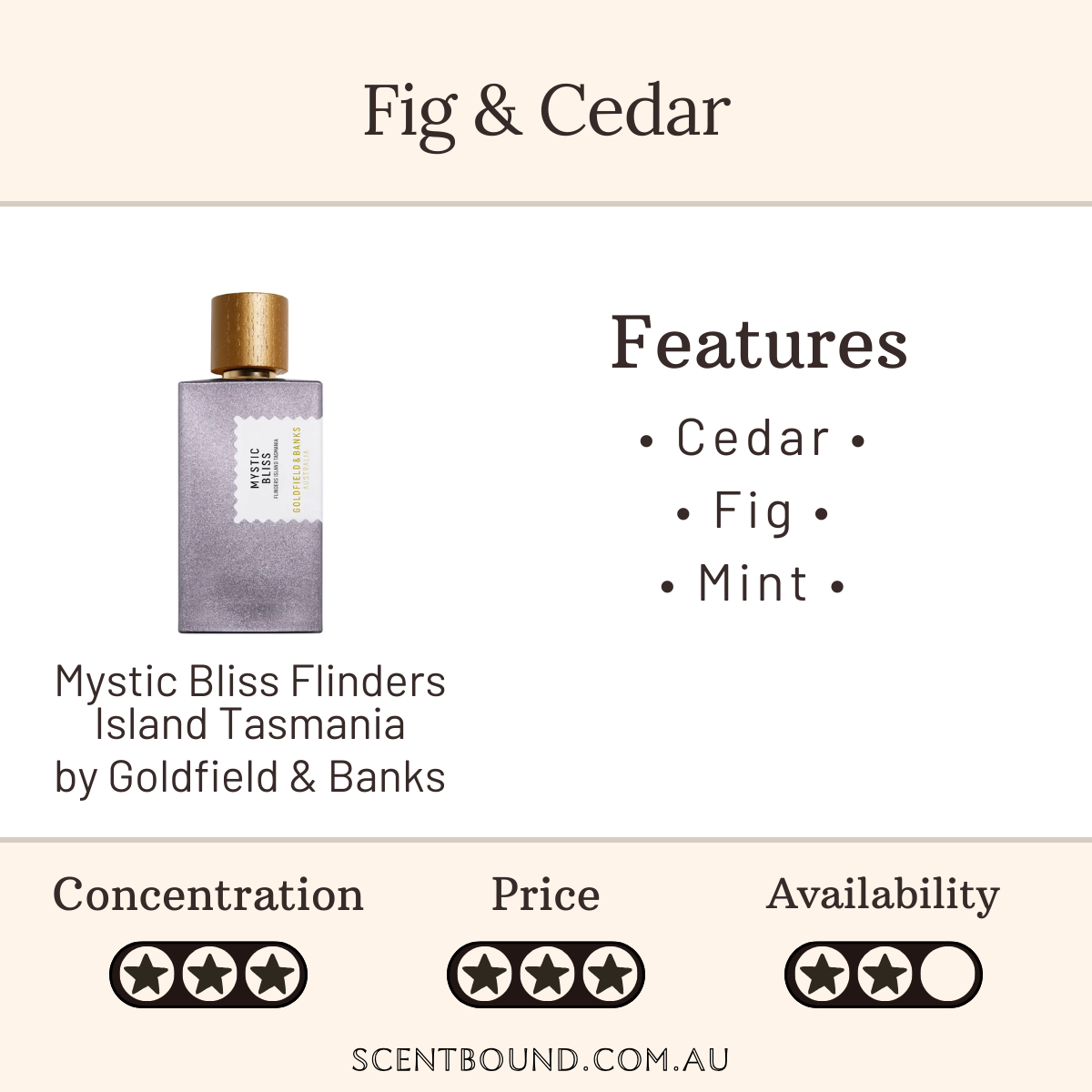 Notes: Top notes are Fig, Mint and Cassis; middle note is Kunzea; base notes are Cedar, Orris and Incense.