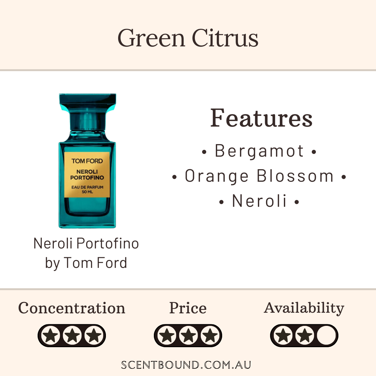 Notes: Top notes are Bergamot, Mandarin Orange, Lemon, Bitter Orange, Lavender, Rosemary and Myrtle; middle notes are African Orange Flower, Neroli, Jasmine and Pitosporum; base notes are Amber, Angelica and Ambrette (Musk Mallow).
