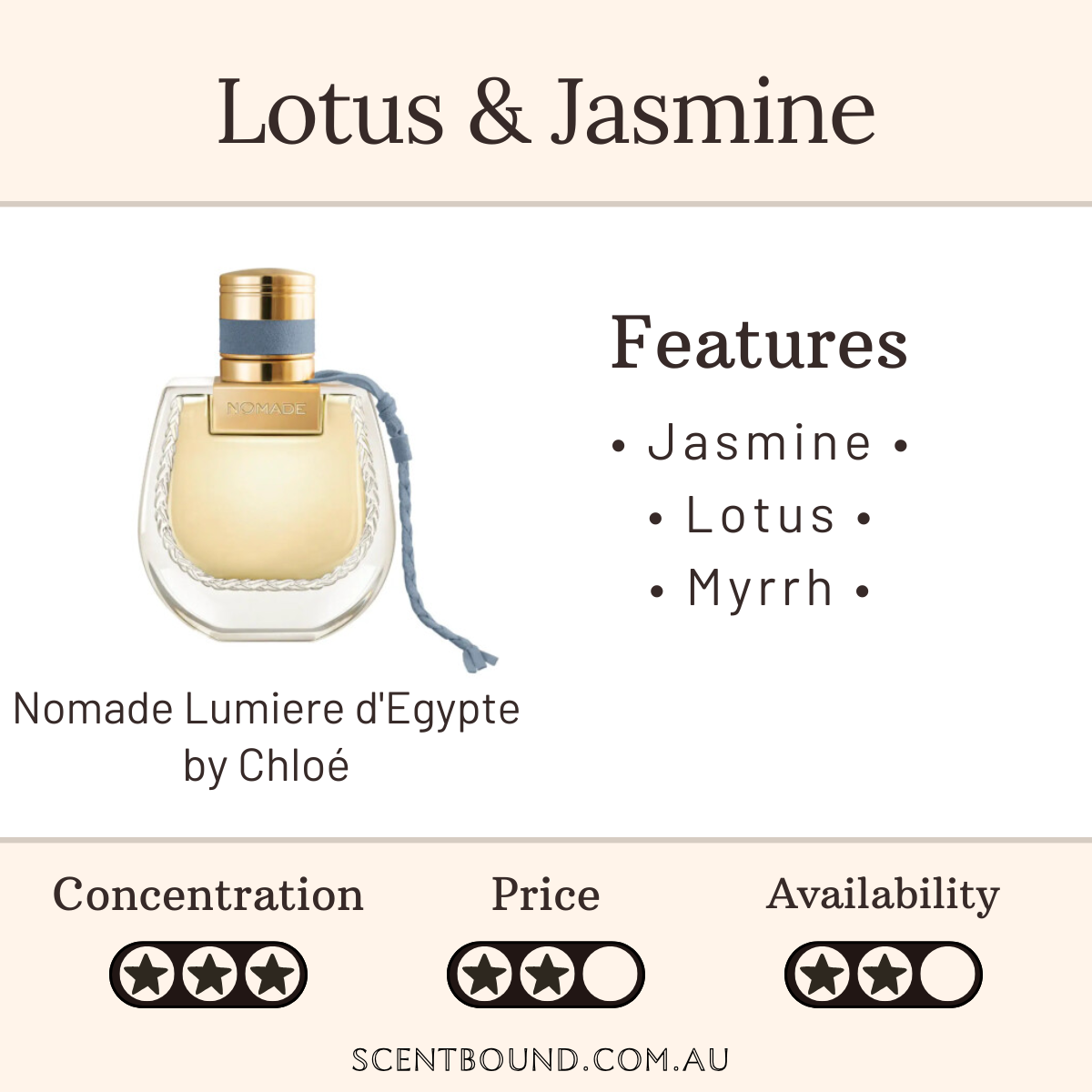 Description: Nomade Lumière d'Égypte by Chloé is a luminous fragrance inspired by the landscapes of Egypt. This perfume opens with aquatic and airy floral notes of blue lotus accord, complemented by the warmth of sensual jasmine. The scent is grounded by a kyphi accord, a bespoke blend of cinnamon bark, sandalwood, and myrrh, enriched with pink berry and elemi essential oil.