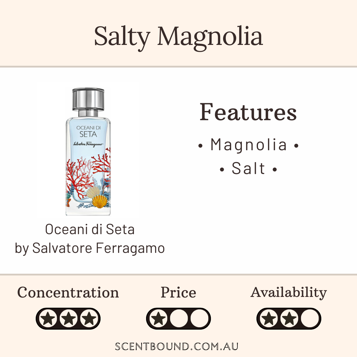 Notes: Top note is Sea Salt; middle note is Magnolia Petals; base note is Heliotrope.