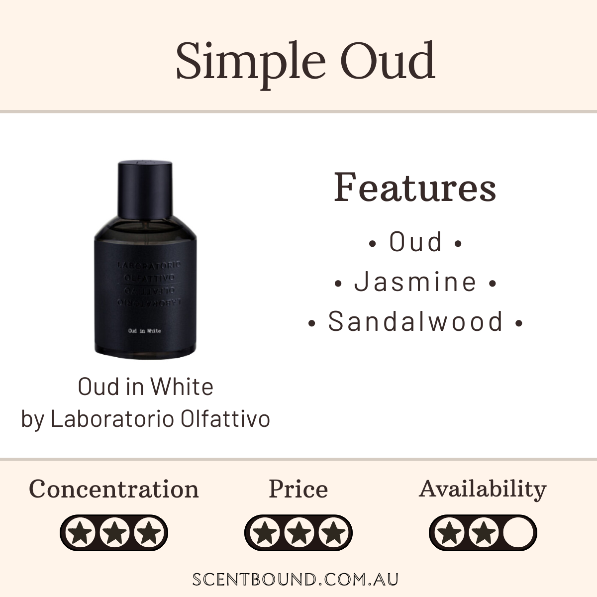 Base notes: Cistus labdanum (Rockrose), Sandalwood (Sri Lankan), Oud (Cambodian)