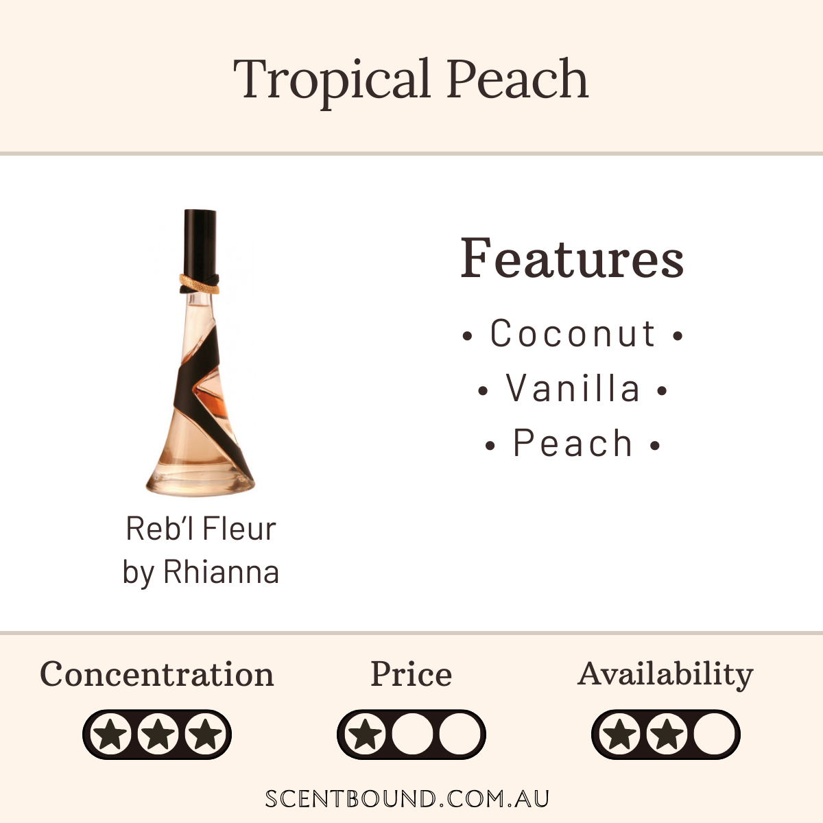 You can probably smell: Coconut, vanilla, peach, patchouli and some plum.