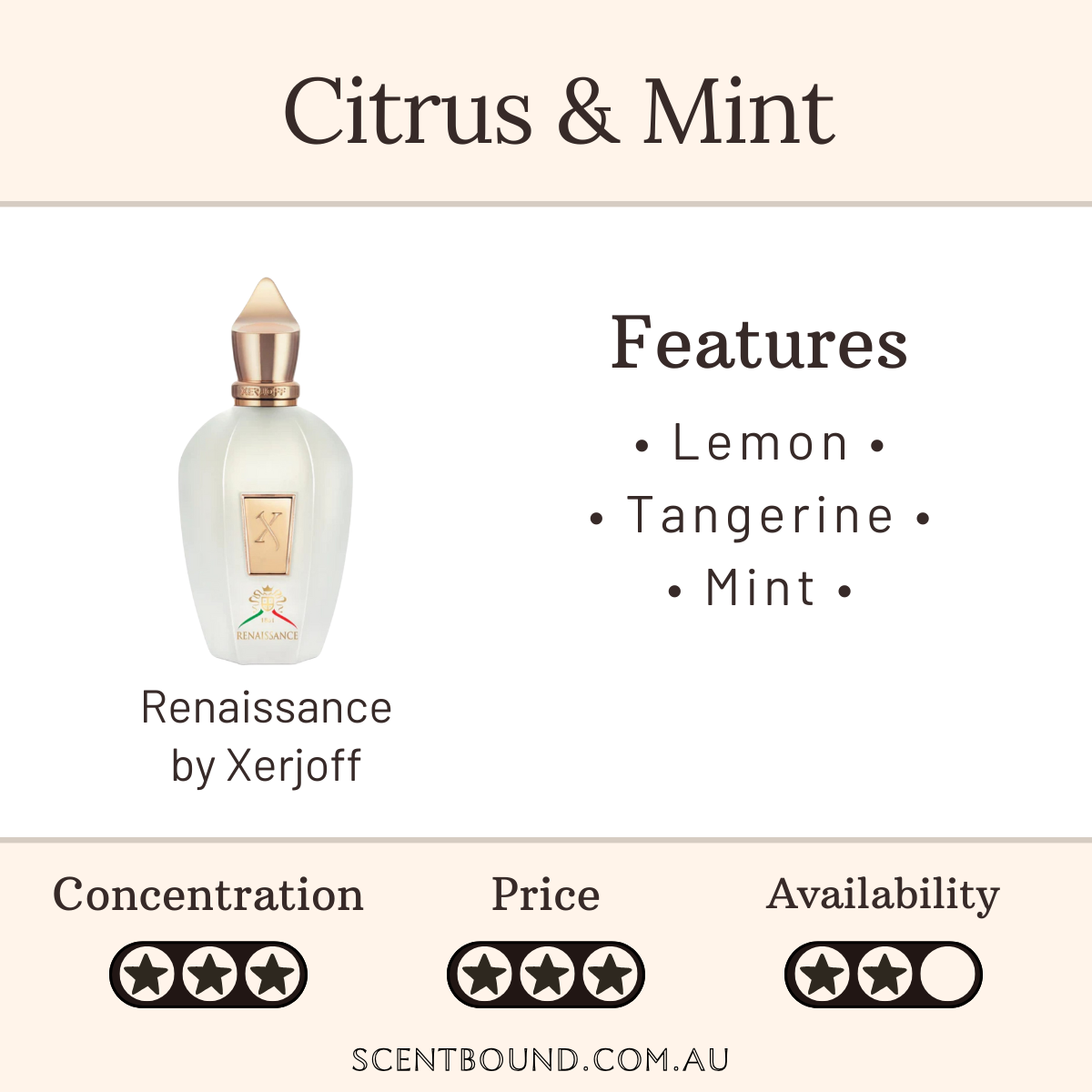 Description: Renaissance represents the inspiring character of Italy, opening with fresh top notes of Calabrian bergamot, mandarin and lemon. An enchanting heart of Bulgarian rose, mint and blossoming Lily of the Valley represents the exquisite and varied beauty of Italy while classically warm Xerjoff renaissance basenotes of cedar wood, patchouli, amber and musk dance across the skin with impeccable delicacy.
