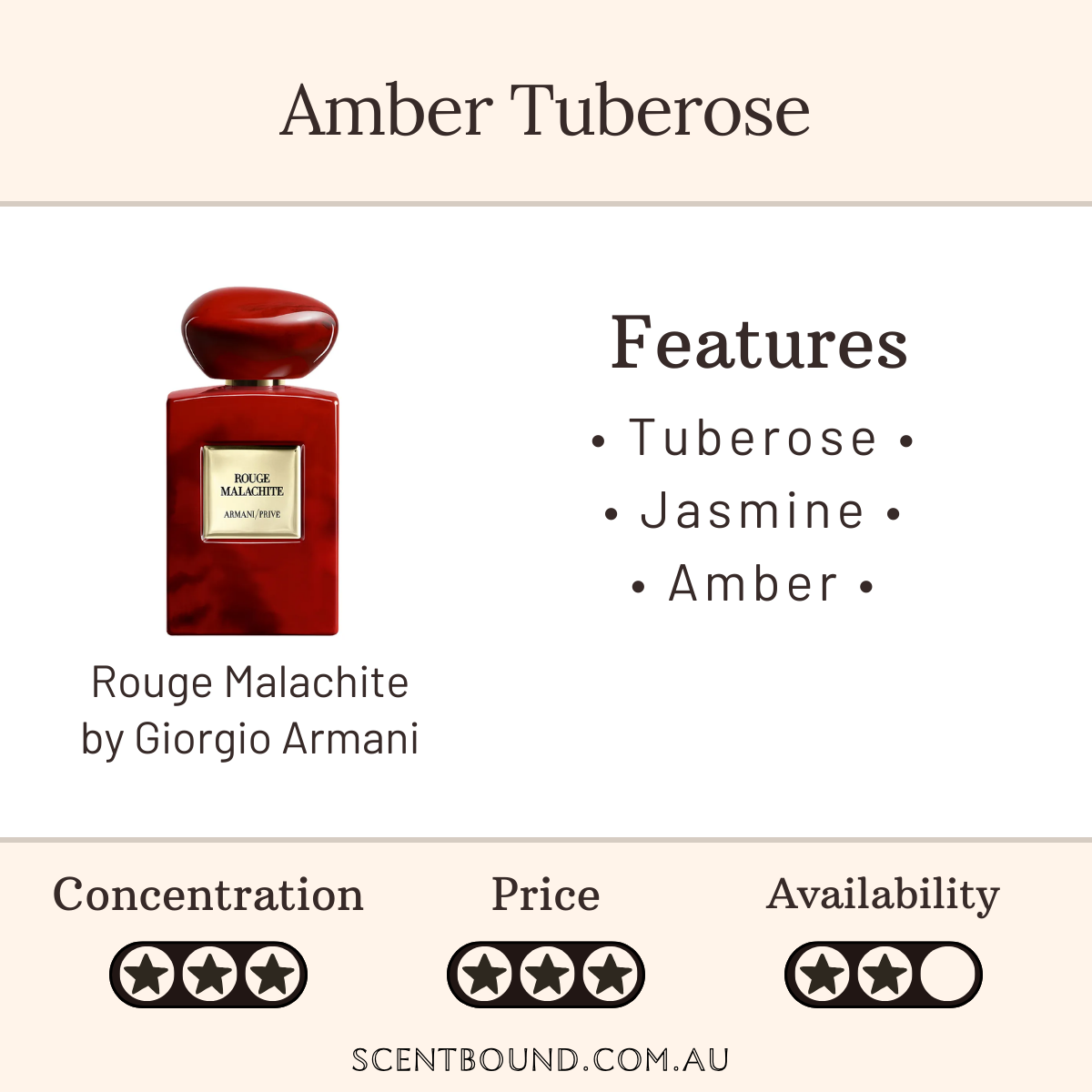 Top notes are Tuberose, Pink Pepper and Clary Sage; middle notes are Tuberose, Jasmine Sambac, Ylang-Ylang, Benzoin, Cashmeran and Orange Blossom; base notes are Tuberose and Amber.