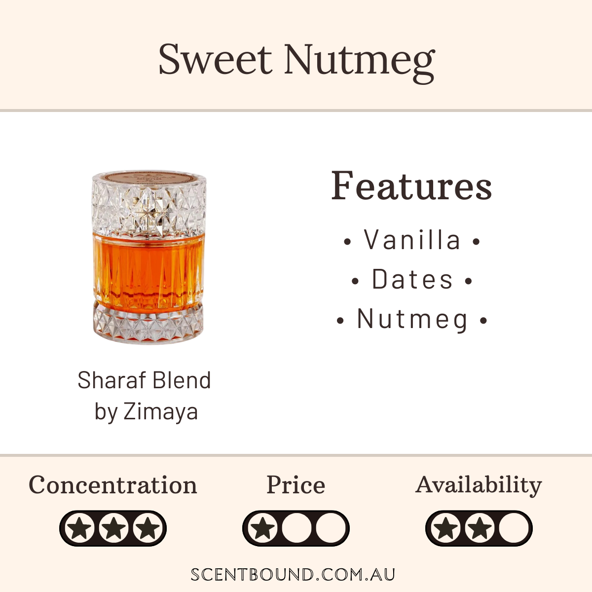 Notes: Top notes are Dates, Nutmeg and Saffron; middle notes are Vanilla, Praline and Tuberose; base notes are Tonka Bean, Amberwood, Benzoin and Musk.