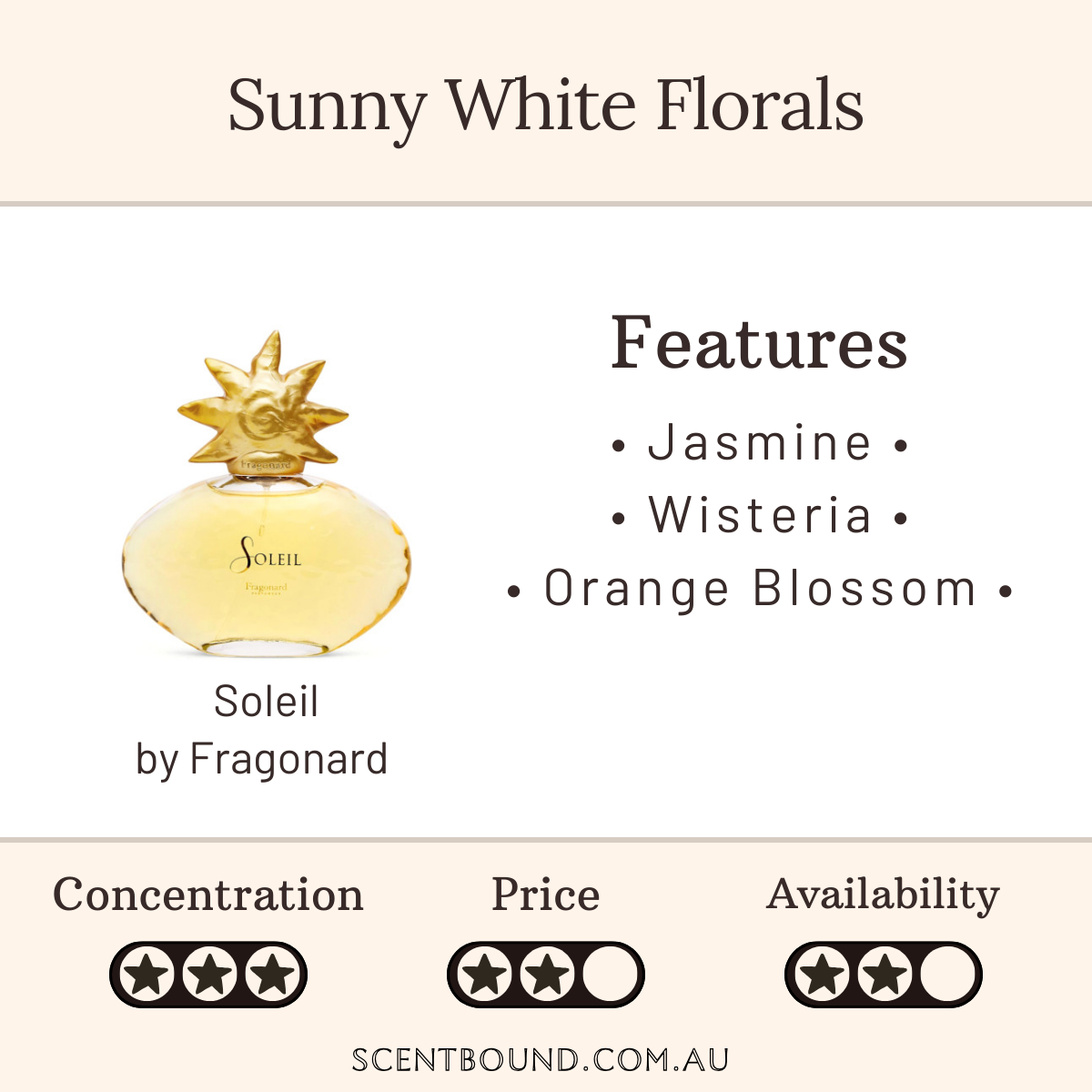 Description: Soleil is a heady blend of flowers – jasmine and orange blossom, lily and rose, iris and wisteria – offset by amber, sandalwood and musk. An intensely radiant fragrance that irresistibly evokes the noontide southern sun.