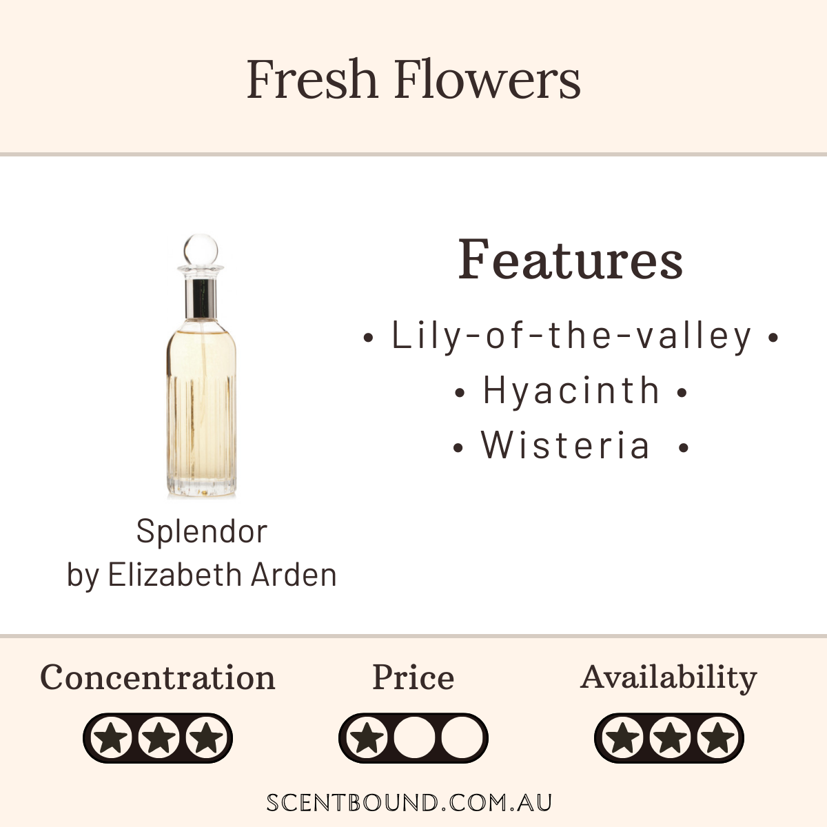 Notes: Top notes are Hiacynth, Wisteria, Freesia, Peony, Sweet Pea, Apple, Bergamot and Pineapple; middle notes are Lily-of-the-Valley, Lily, Jasmine, Magnolia, Tea Rose, Rose, Orchid and Poppy; base notes are Musk, Cedar, Sandalwood, dark woodsy notes, Brazilian Rosewood and Amber.
