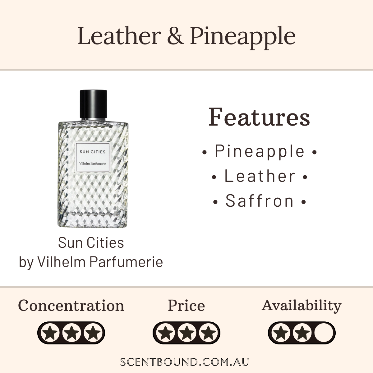 You can probably smell: Pineapple, leather and saffron.