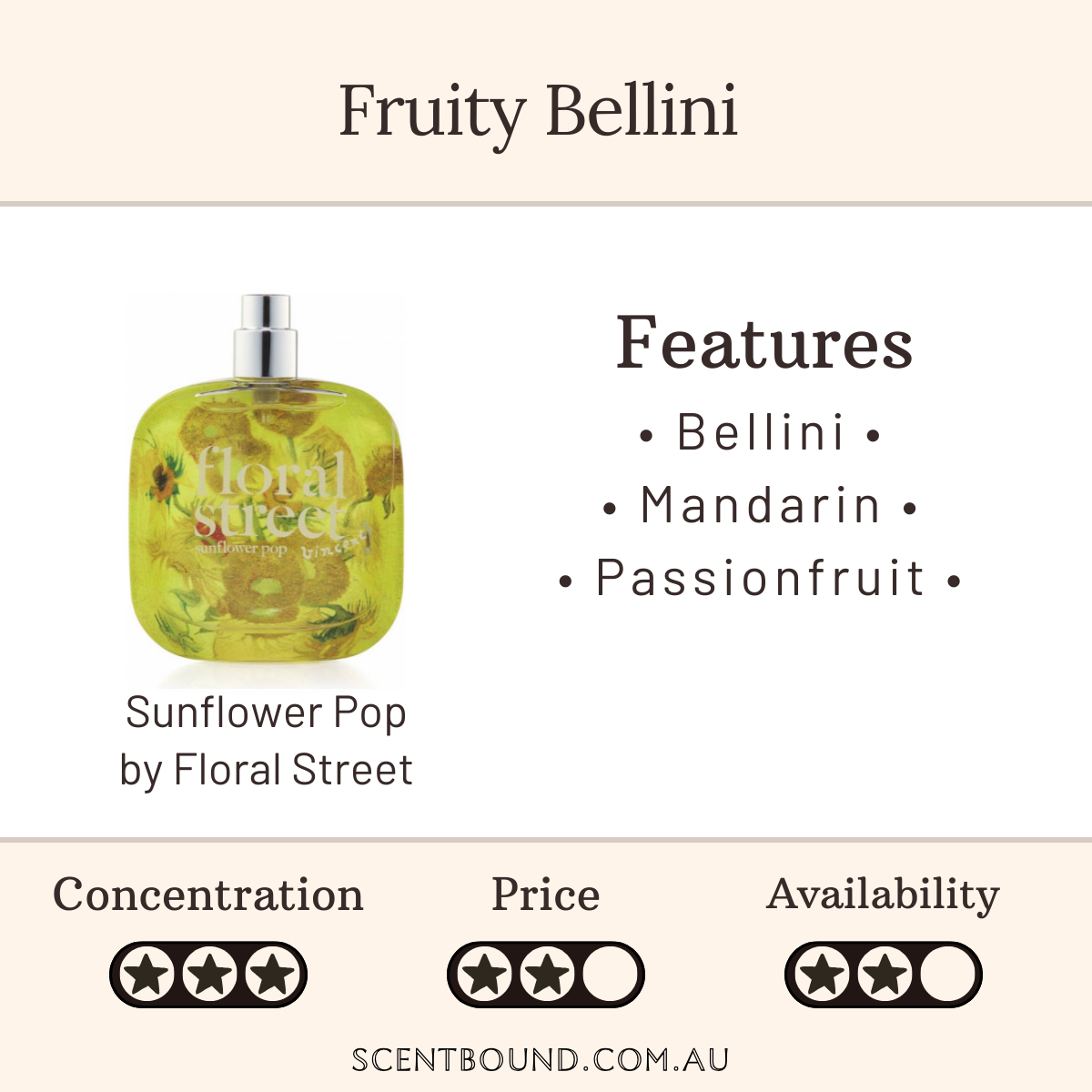 You can probably smell: Bellini (a peachy and sparkling accord), mandarin, passionfruit.