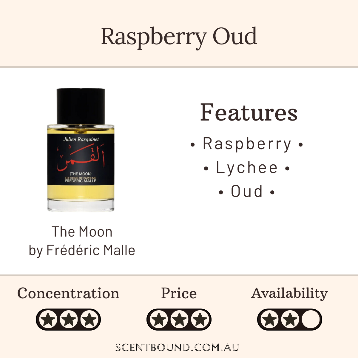 You can probably smell: Oud, Leather, Fruity notes of raspberry, lychee and red currant, some rose.