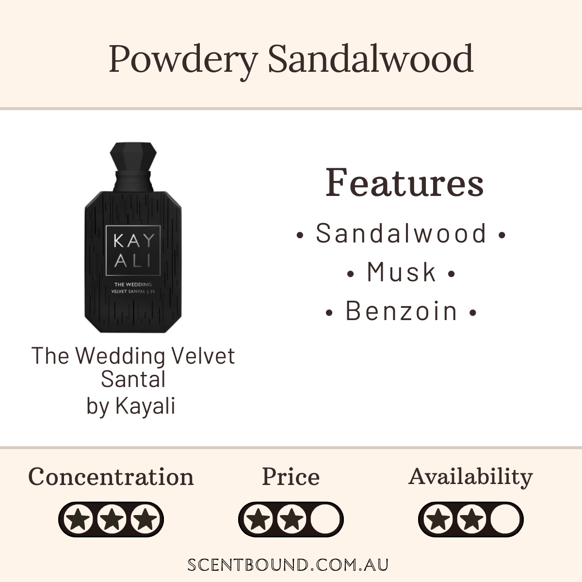 You can probably smell: Mostly a powdery sandalwood, with benzoin and musk.