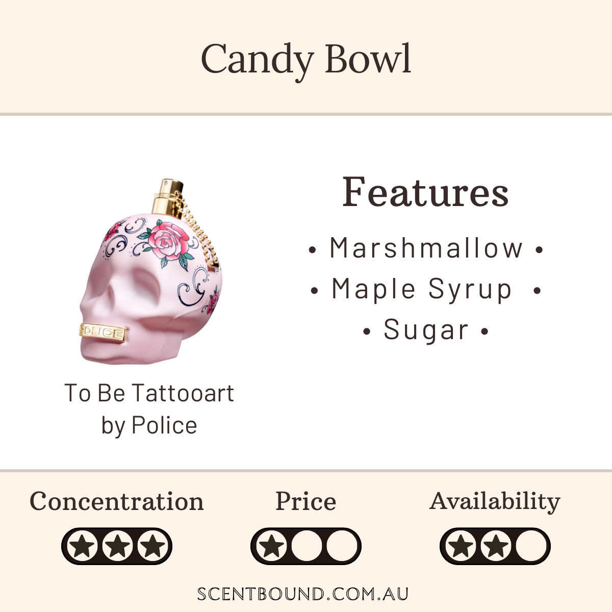 Description: This fragrance is the synthesis of modern femininity and seductive power. It opens with transparent apple blossom, fruity plum, and delicious maple syrup. Soft musk accords are surrounded by creamy sandalwood and a powdery-sweet marshmallow accord in the base.