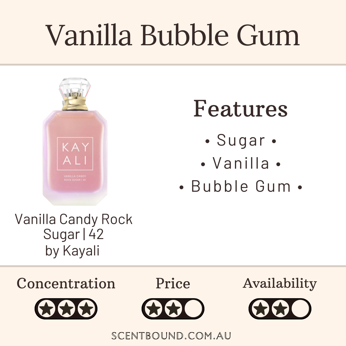 Notes: Top notes are Vanilla, Pear, Marshmallow, Rum, Violet Leaves and Ylang-Ylang; middle notes are Bubble Gum, Jellybean, Caramel, Jasmine and Labdanum; base notes are Sugar, Patchouli, Tonka, Cashmere Wood, Sandalwood and Vetiver.