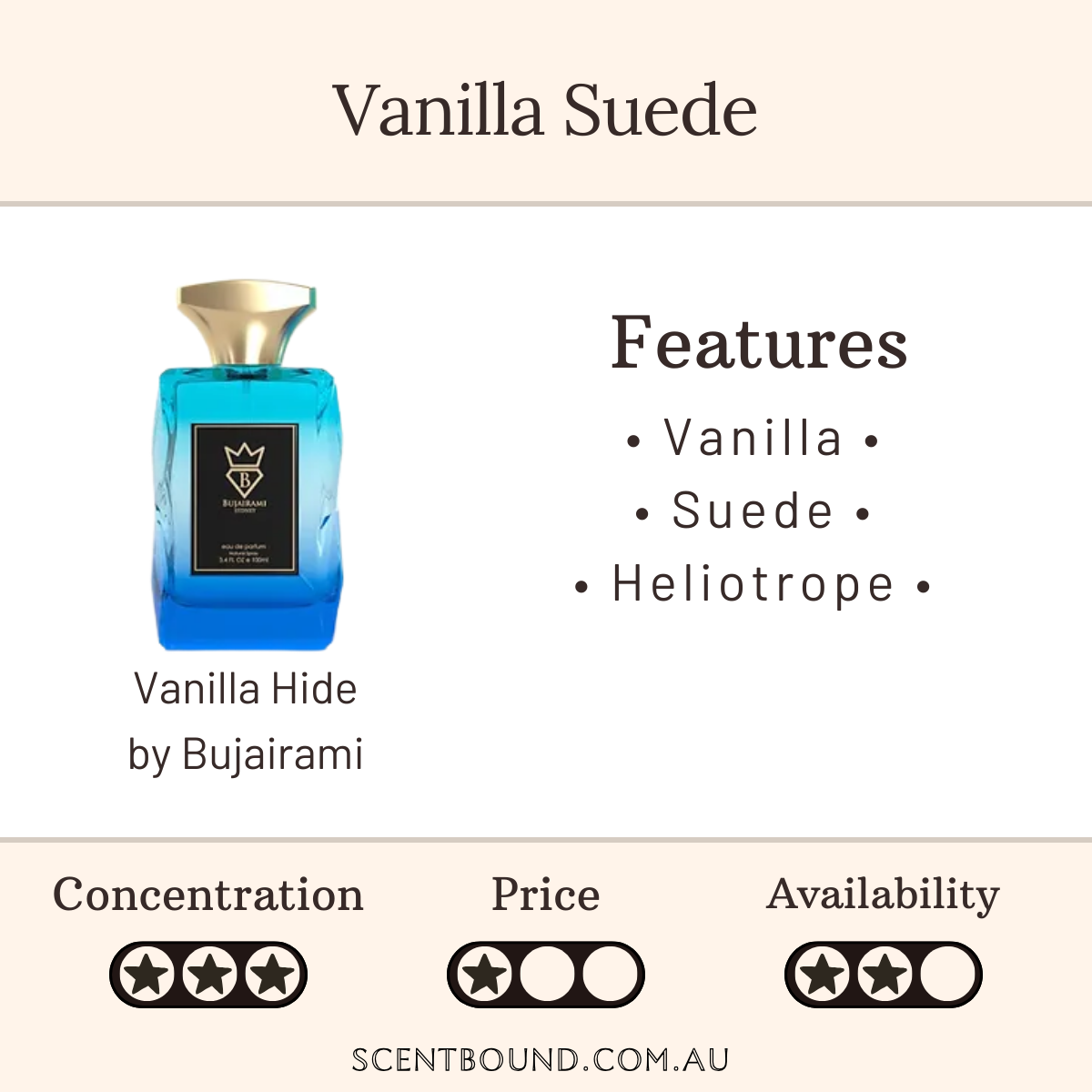 You can probably smell: Vanilla, Suede, Heliotrope and Amber.