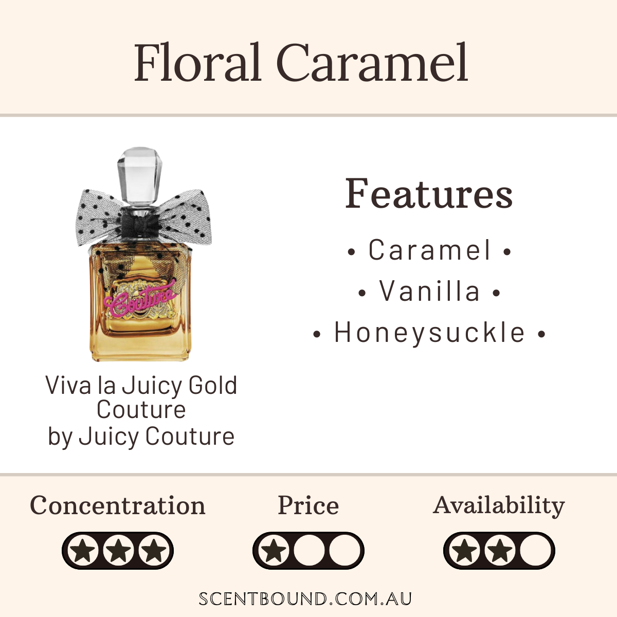 Description: Viva La Juicy Gold Couture perfume indulges the senses with luscious wild berries, a kiss of honeysuckle, and a luxurious elixir of golden amber, melted caramel, and vanilla. The Viva La Juicy Gold Couture girl is couture all the way, spinning an addictive web of glamour at every A-list event.
