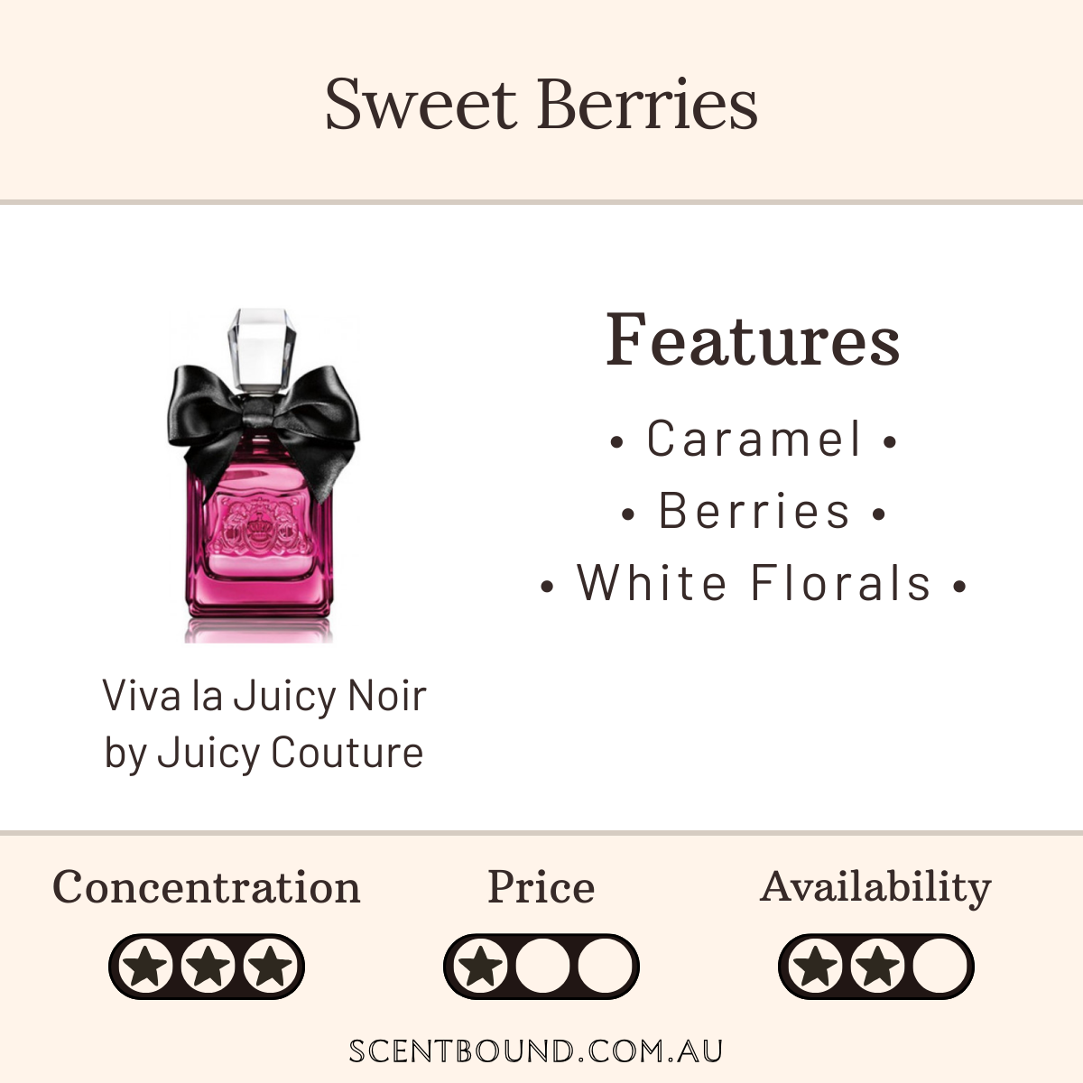 Notes: Top notes are Wild Berries and Mandarin Orange; middle notes are Gardenia, Honeysuckle and Jasmine; base notes are Caramel, Vanilla, Amber and Sandalwood.