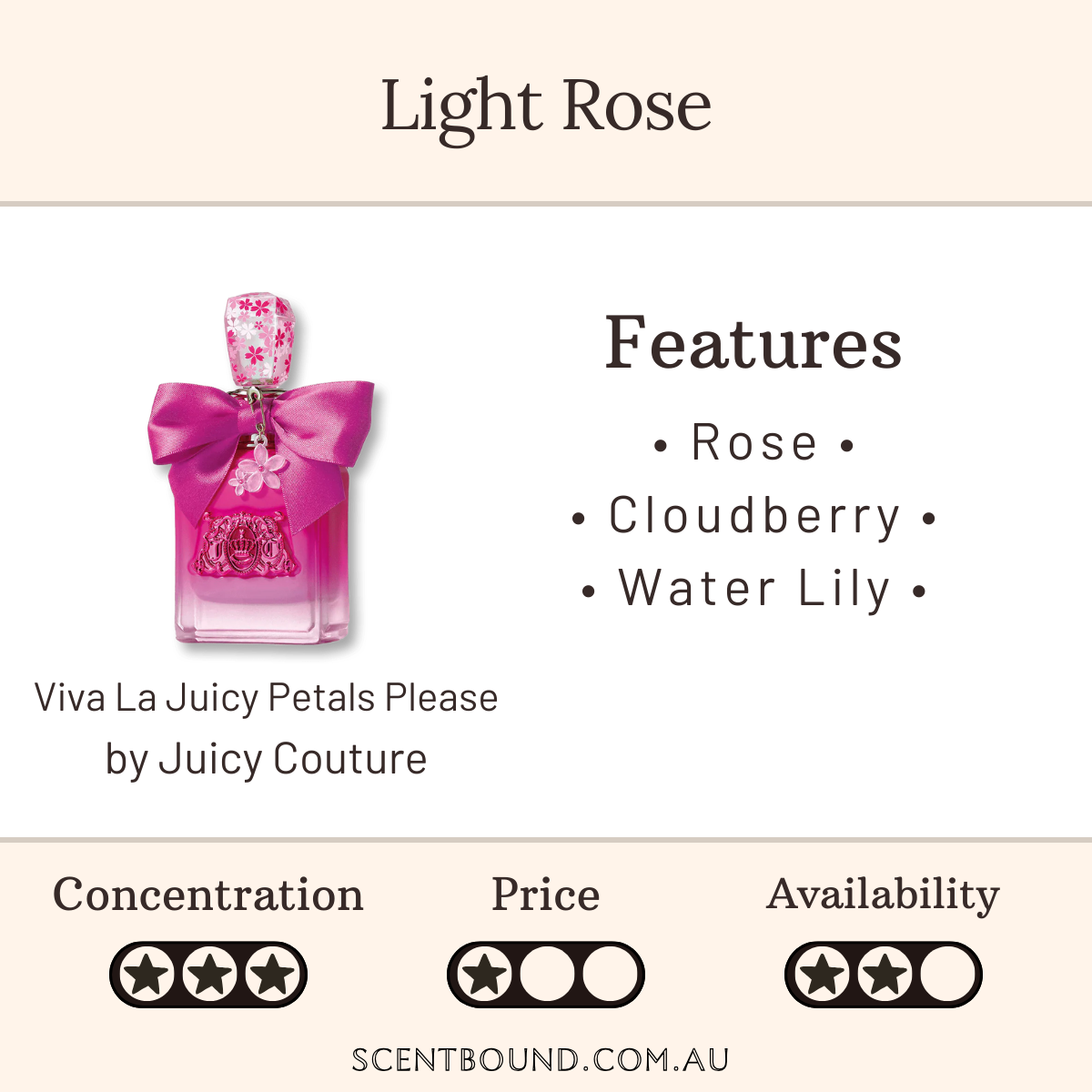 You can probably smell: Rosewater, Cloudberry and white florals (water lily, gardenia and freesia).