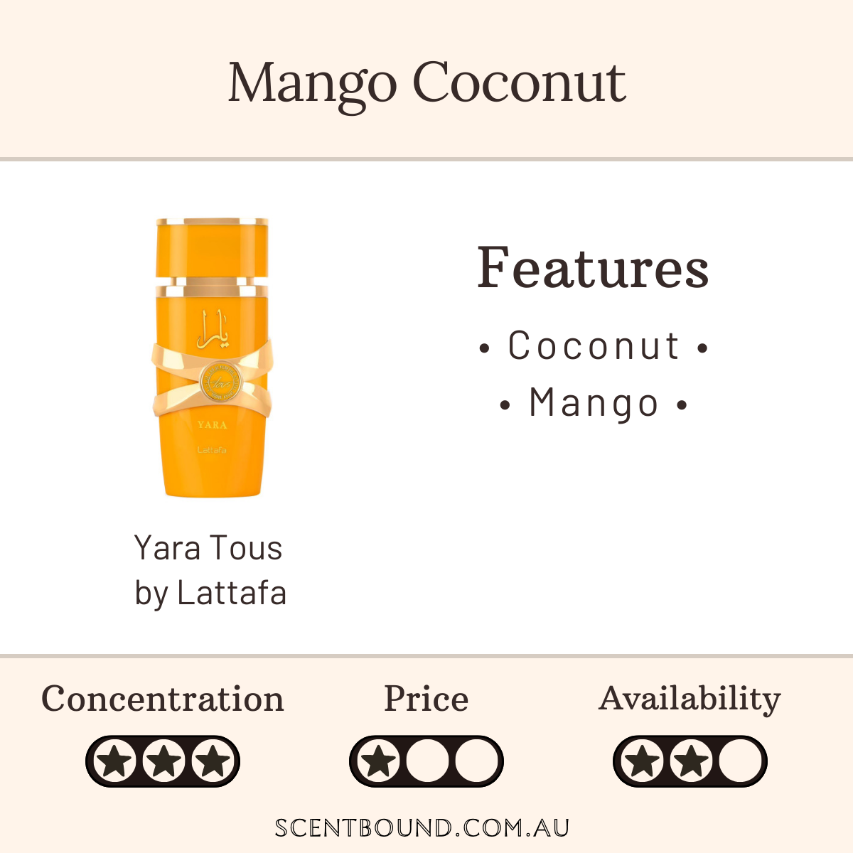 Notes: Top notes are Mango, Coconut and Passionfruit; middle notes are Jasmine, Orange Blossom and Heliotrope; base notes are Vanilla, Musk and Cashmeran.